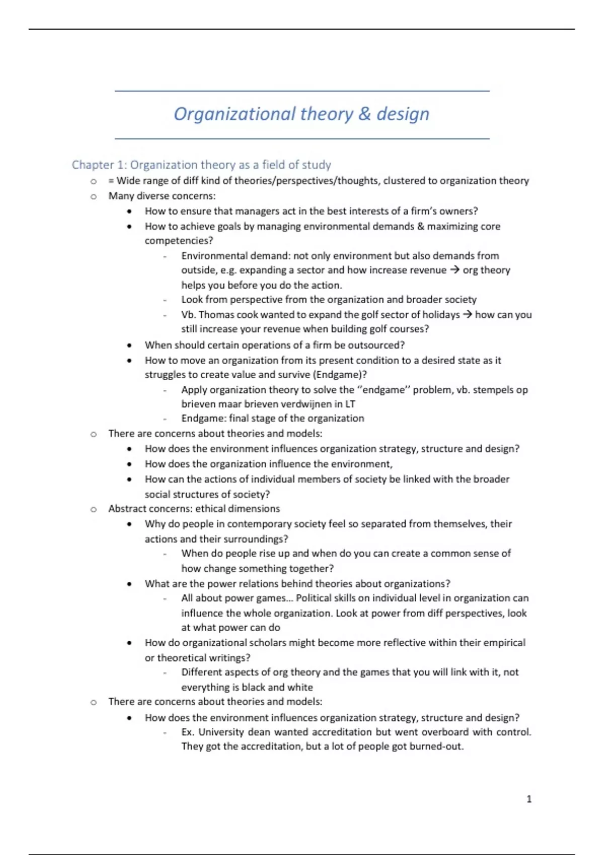 Samenvatting van alle lessen en gastlessen van het vak organizational theory and design gegeven door steffi weil.