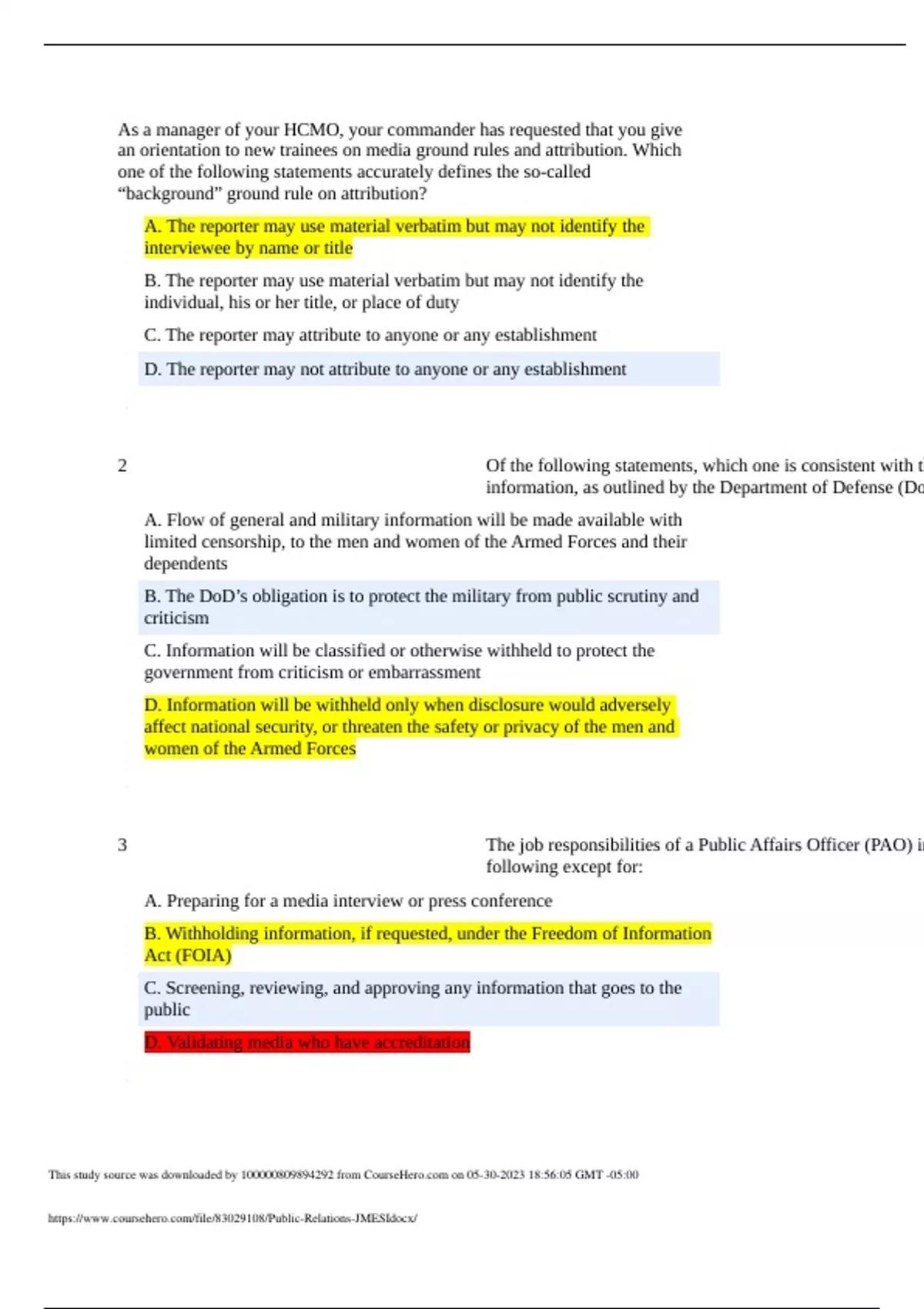 As a manager of your HCMO, your commander has requested that you give an orientation to new trainees on media ground rules and attribution. Which one of the following statements accurately defines the so-called “background” ground rule on attribution? A. The reporter may use material verbatim but may not identify the interviewee by name or title B. The reporter may use material verbatim but may not identify the individual, his or her title, or place of duty C. The reporter may attribute to anyone or any establishment D. The reporter may not attribute to anyone or any establishment Incorrect 2 Of the following statements, which one is consistent with the p information, as outlined by the Department of Defense (DoD)? A. Flow of general and military information will be made available with limited censorship, to the men and women of the Armed Forces and their dependents B. The DoD’s obligation is to protect the military from public scrutiny and criticism Incorrect C. Information will be classified or otherwise withheld to protect the government from criticism or embarrassment D. Information will be withheld only when disclosure would adversely affect national security, or threaten the safety or privacy of the men and women of the Armed Forces 3 The job responsibilities of a Public Affairs Officer (PAO) inclu following except for: A. Preparing for a media interview or press conference B. Withholding information, if requested, under the Freedom of Information Act (FOIA) C. Screening, reviewing, and approving any information that goes to the public Incorrect D. Validating media who have accreditation 4 In calling and conducting a news conference, the HCMO comm should take all of the following steps except: A. Invite all news media likely to be interested Incorrect B. Designate the Public Affairs Officer (PAO) as the primary official responsible for arrangements C. Ensure the PAO provides ground rules to media at the end of the news conference D. Prepare spokespersons or subject matter experts to answer questions frankly and candidly 5 The traditional four “Ps” of marketing include: A. Public B. Place C. Presentation Incorrect D. Pitch 6 Senior administrators decided to teach interview principles and equip staff members with the skills to effectively communicate media and public. One of the senior leaders asked the group to technique of flagging, and the response was: A. Make sure facial expressions and hand gestures are appropriate to the words and seriousness of the issue B. Take advantage of opportunities before and during the interview to help focuson what you want to talk about Incorrect C. Underscore, both verbally and nonverbally, what’s important; use voice inflection, a hand gesture, eye contact, body language or a phrase like, “What is really critical to know about this issue…” D. Put significant information (the key message) at the beginning of the interview 7 You are heading up a new community outreach program, estab HCMO, and have been asked to field questions at an upcoming conference. Of the following, what would be the most appropr communicating with the media? A. Ask people in your organization who are willing to give an interview to speak with the media on your behalf B. Consult your local Public Affairs Officer (PAO) for advice and guidance Correct C. Send a press kit containing general information and a cover letter introducing yourself to local journalists D. Set up a series of meetings with editors of community newspapers and news directors at your local radio and television stations 8 Which of the following is not considered a valid interviewing t A. Using non-verbals B. Enthusiasm C. Flagging D. Using metaphors Correct 9 Which one of the following statements is false regarding accre civilian media? A. Accreditation helps foster a professional relationship between the military and the media B. The Office of the Secretary of Defense (Public Affairs) and the Commanders in Chief (CINCs) will establish criteria for the accreditation of news media representatives C. It is a method of identifying correspondents with a legitimate need for gathering news about military affairs D. Accreditation provides correspondents with special privileges, including access to commanders Correct 10 To effectively promote your HCMO to various target audience duty officers, local officials, leaders of business, and civilian h organizations, etc.), you develop a strategic communications p incorporates all of the following elements: A. Message, media outlets, and target audiences Incorrect B. Purpose, goals, objectives, audiences, strategies/tactics, and evaluation C. Media resources, community relations activities, financial resources, and outcomes D. Communication methods, resources, and media contacts 11 Following a news conference, the commander of an HCMO tra conference from the tape or video recording, prepares a news r conference, and distributes it to news media that were intereste but could not. What is the next step that needs to be taken? A. Send out “thank you” memos to conference attendees B. Provide an interim report (including key statements made, questions and responses) on the news conference for superiors and principals C. Review the tape or video recording of the conference with a PAO D. Report conference results to radio and television stations to secure ties with the media Incorrect 12 An inexperienced member of your staff decided to speak with a recently developed HCMO program. He responded to multip with “no comment” because the answers were considered class one of the following interview principles/techniques did he fai A. Bridging B. Honesty C. Protecting the record Incorrect D. Hooking