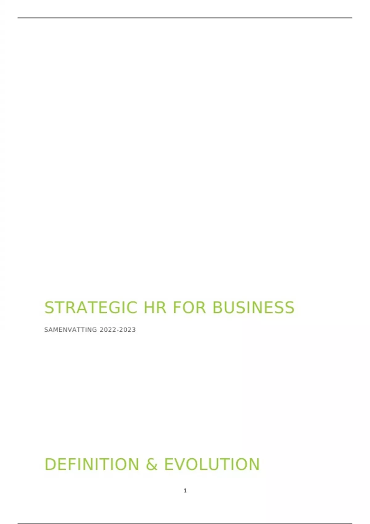 Dit is een samenvatting van alle lessen en PPT's voor het vak Strategic HR for Business op de Arteveldehogeschool. Dit is een eerstejaarsvak in de richting Business & Languages/Organisatie & Management met afstudeerrichting HR.