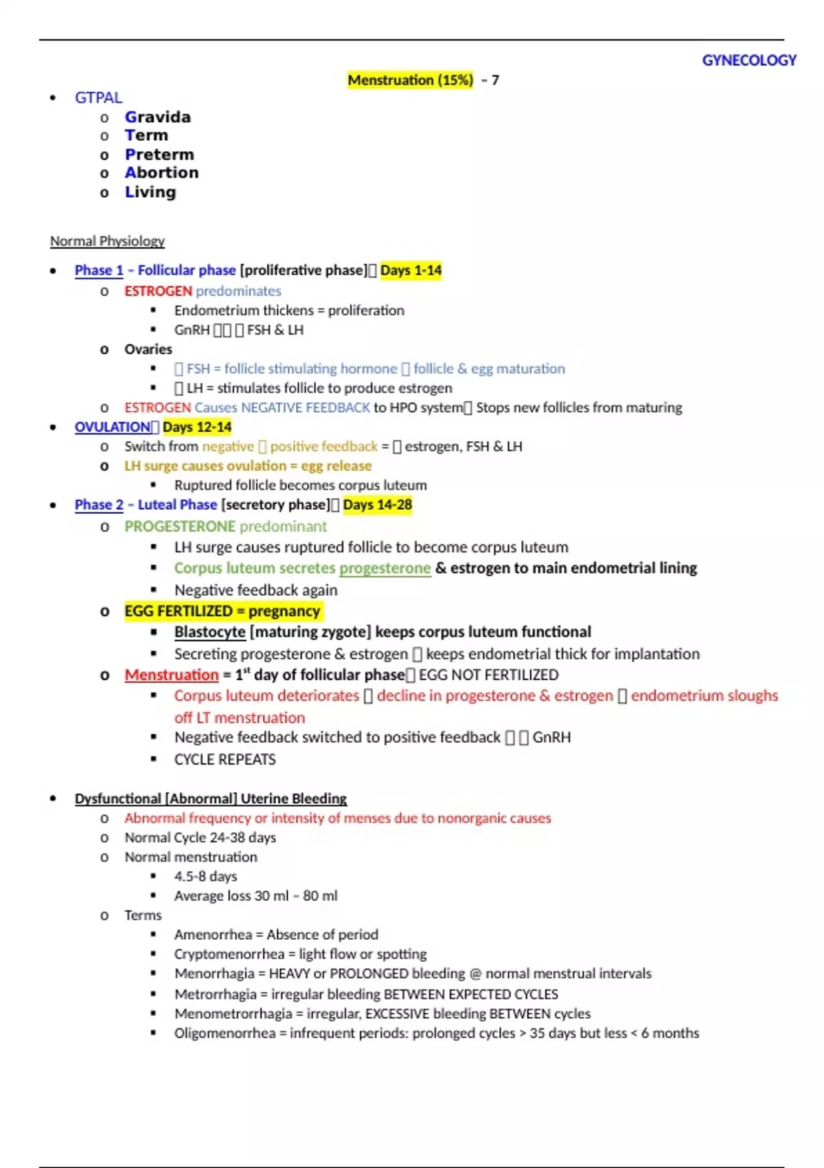 Menstruation (15%) – 7 GTPAL o Gravida o Term o Preterm o Abortion o Living Normal Physiology Phase 1 – Follicular phase [proliferative phase] Days 1-14 o ESTROGEN predominates Endometrium thickens = proliferation GnRH FSH & LH o Ovaries FSH = follicle stimulating hormone follicle & egg maturation LH = stimulates follicle to produce estrogen o ESTROGEN Causes NEGATIVE FEEDBACK to HPO system Stops new follicles from maturing OVULATION Days 12-14 o Switch from negative positive feedback = estrogen, FSH & LH o LH surge causes ovulation = egg release Ruptured follicle becomes corpus luteum Phase 2 – Luteal Phase [secretory phase] Days 14-28 o PROGESTERONE predominant LH surge causes ruptured follicle to become corpus luteum Corpus luteum secretes progesterone & estrogen to main endometrial lining Negative feedback again o EGG FERTILIZED = pregnancy Blastocyte [maturing zygote] keeps corpus luteum functional Secreting progesterone & estrogen keeps endometrial thick for implantation o Menstruation = 1st day of follicular phase EGG NOT FERTILIZED Corpus luteum deteriorates decline in progesterone & estrogen endometrium sloughs off LT menstruation Negative feedback switched to positive feedback GnRH CYCLE REPEATS Dysfunctional [Abnormal] Uterine Bleeding o Abnormal frequency or intensity of menses due to nonorganic causes o Normal Cycle 24-38 days o Normal menstruation 4.5-8 days Average loss 30 ml – 80 ml o Terms Amenorrhea = Absence of period Cryptomenorrhea = light flow or spotting Menorrhagia = HEAVY or PROLONGED bleeding @ normal menstrual intervals Metrorrhagia = irregular bleeding BETWEEN EXPECTED CYCLES Menometrorrhagia = irregular, EXCESSIVE bleeding BETWEEN cycles Oligomenorrhea = infrequent periods: prolonged cycles > 35 days but less < 6 months Polymenorrhagia = frequent cycle intervals < 21 days o Etiology Chronic anovulation – 90% Disruption of hypothalamus-pituitary axis Seen w/ extreme ages: teenagers soon after menarche & perimenopausal UNOPPOSED ESTROGEN o Without ovulation = no progesterone = excess estrogen = endometrial growth o Irregular, unpredictable shedding/bleeding Ovulatory – 10% Regular cyclical shedding + ovulation w/ prolonged progesterone section increase blood loss & prostaglandins menorrhagia o Diagnosis of Exclusion No evidence of organic cause & negative pelvic exam Workup Hormone levels Transvaginal US Endometrial biopsy if endometrium >4 mm on US or women >35 y/o R/O endometrial carcinoma o Management 1 – control bleeding Acute severe bleeding o High dose IV estrogens or high dose OCPs o D&C if IV estrogen fails 2 – prevent future bleeding 3 – minimize endometrial cancer risk Anovulatory [90%] & Ovulatory [10%] OCPs = 1st line regulates periods & reduces flow; decreases endometrial CA risk Progesterone IF estrogen is contraindicated GnRH agonists – leuprolide Surgery IF NOT responsive to medical tx Hysterectomy = DEFINITIVE tx for DUB Endometrial ablation – pts who DON’T want a hysterectomy Amenorrhea o Absence of menses o Workup Pregnancy test = MCC of secondary amenorrhea Serum prolactin FSH & LH TSH o Primary Amenorrhea Failure of menarche by 15 w/ secondary sex characteristics by 13 w/o secondary sex characteristics Etiologies Uterus Present & Breast Present o Outflow obstruction Transvaginal septum = 2 compartment Imperforated hymen = no opening into canal, blue bulge Uterus Present – Breast ABSENT o Ovarian Causes elevated FSH & LH Premature ovarian failure – 46XX = early menopause Gonadal dysgenesis = Turner’s 45XO o Normal/Low FSH & LH Hypothalamus-Pituitary Failure Puberty delays – athletes, illness, anorexia Uterus ABSENT & Breast Present o Mullerian agenesis – 46 XX = absence of uterus, cervix, and/or vagina o Androgen insensitivity – 46 XY = genetically male Uterus ABSENT & Breast ABSENT o RARE o Defect in testos