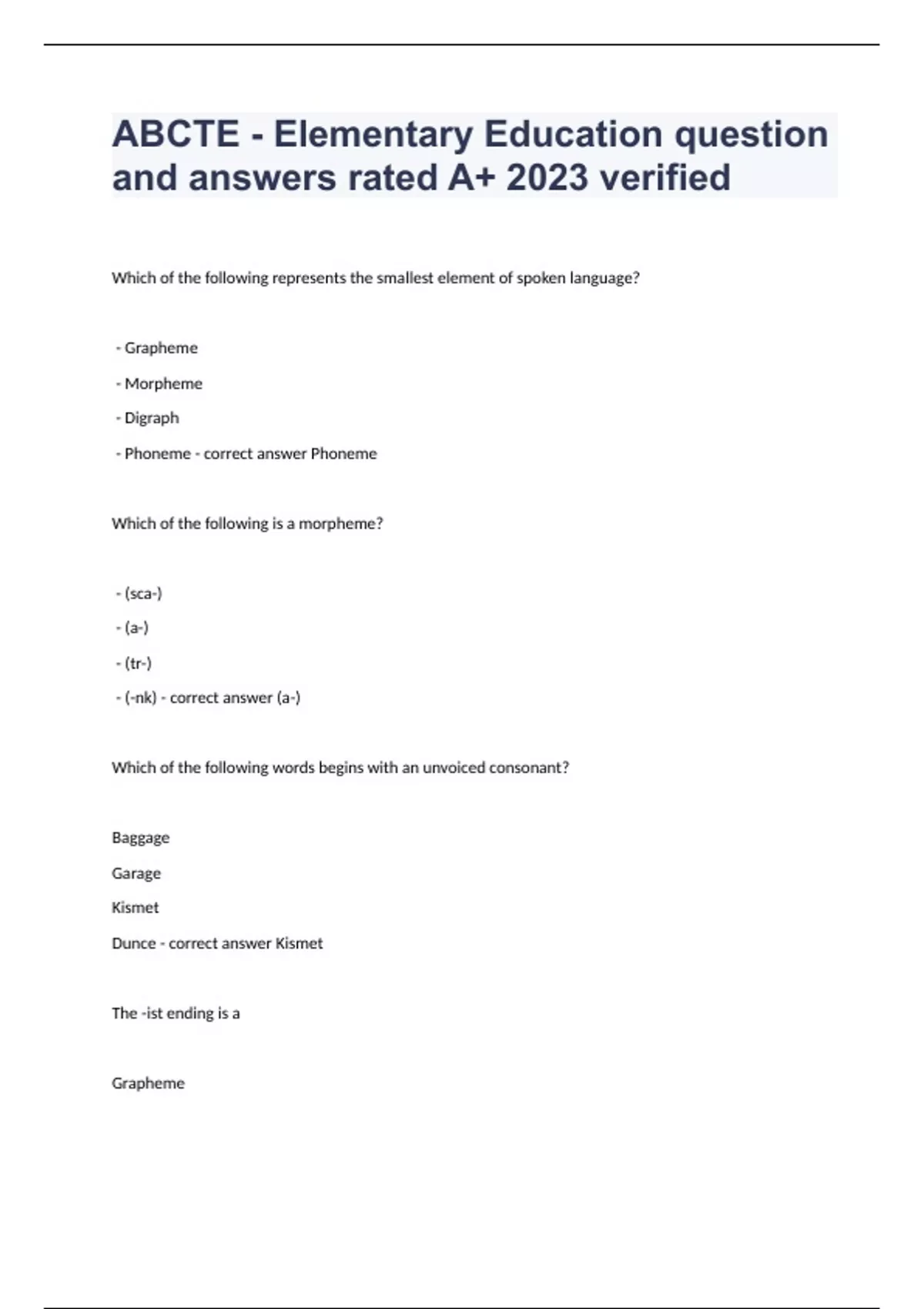 ABCTE - Elementary Education question and answers rated A+ 2023 verifiedWhich of the following represents the smallest element of spoken language? - Grapheme - Morpheme - Digraph - Phoneme - correct answer Phoneme Which of the following is a morpheme? - (sca-) - (a-) - (tr-) - (-nk) - correct answer (a-) Which of the following words begins with an unvoiced consonant? Baggage Garage Kismet Dunce - correct answer Kismet The -ist ending is a Grapheme Morpheme Phoneme Lexeme - correct answer Morpheme Which of the following phonological awareness skills is integral to analogy phonics? - Knowing that text runs from the top of the page to the bottom - Recognizing that spoken sentences are composed of individual words - Knowing how to segment sentences into words - Recognizing when words begin or end with the same sound - correct answer Recognizing when words begin or end with the same sound