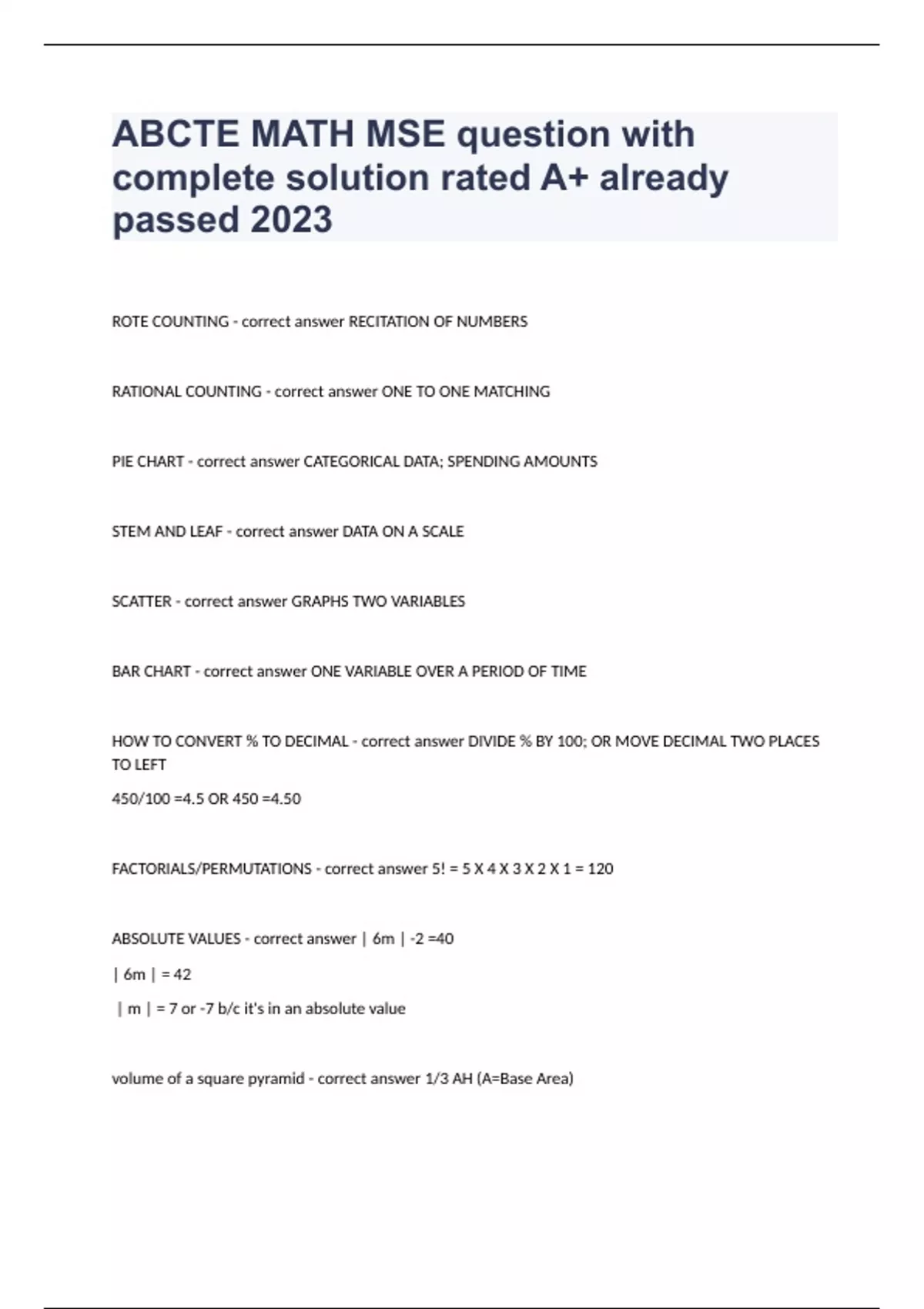 ABCTE MATH MSE question with complete solution rated A+ already passed 2023ROTE COUNTING - correct answer RECITATION OF NUMBERS RATIONAL COUNTING - correct answer ONE TO ONE MATCHING PIE CHART - correct answer CATEGORICAL DATA; SPENDING AMOUNTS STEM AND LEAF - correct answer DATA ON A SCALE SCATTER - correct answer GRAPHS TWO VARIABLES BAR CHART - correct answer ONE VARIABLE OVER A PERIOD OF TIME HOW TO CONVERT % TO DECIMAL - correct answer DIVIDE % BY 100; OR MOVE DECIMAL TWO PLACES TO LEFT 450/100 =4.5 OR 450 =4.50 FACTORIALS/PERMUTATIONS - correct answer 5! = 5 X 4 X 3 X 2 X 1 = 120 ABSOLUTE VALUES - correct answer | 6m | -2 =40 | 6m | = 42 | m | = 7 or -7 b/c it's in an absolute value volume of a square pyramid - correct answer 1/3 AH (A=Base Area)