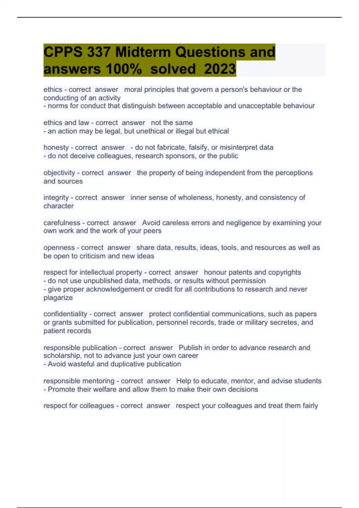 CPPS 337 Midterm Questions and answers 100% solved 2023ethics moral principles that govern a person's behaviour or the conducting of an activity - norms for conduct that distinguish between acceptable and unacceptable behaviour ethics and law not the same - an action may be legal, but unethical or illegal but ethical honesty - do not fabricate, falsify, or misinterpret data - do not deceive colleagues, research sponsors, or the public objectivity the property of being independent from the perceptions and sources integrity inner sense of wholeness, honesty, and consistency of character carefulness Avoid careless errors and negligence by examining your own work and the work of your peers openness share data, results, ideas, tools, and resources as well as be open to criticism and new ideas respect for intellectual property honour patents and copyrights - do not use unpublished data, methods, or results without permission - give proper acknowledgement or credit for all contributions to research and never plagarize confidentiality protect confidential communications, such as papers or grants submitted for publication, personnel records, trade or military secretes, and patient records responsible publication Publish in order to advance research and scholarship, not to advance just your own career - Avoid wasteful and duplicative publication responsible mentoring Help to educate, mentor, and advise students - Promote their welfare and allow them to make their own decisions respect for colleagues respect your colleagues and treat them fairly social responsibility strive to promote social good ad prevent or mitigate social harms through research, public education, and advocacy non-discrimination Avoid discrimination against colleagues or students on the basis of sex, race, ethnicity, or other factors that are not related to their scientific competence and integrity competence maintain and improve your own prfessional competence and expertise through lifelong education and learning as well as take steps to promote competence in science as a whole legality Know and obey relevant laws and institutional and governmental policies animal care Show proper respect and care for animals when using them in research - Do not conduct unnecessary or poorly designed animal experiments