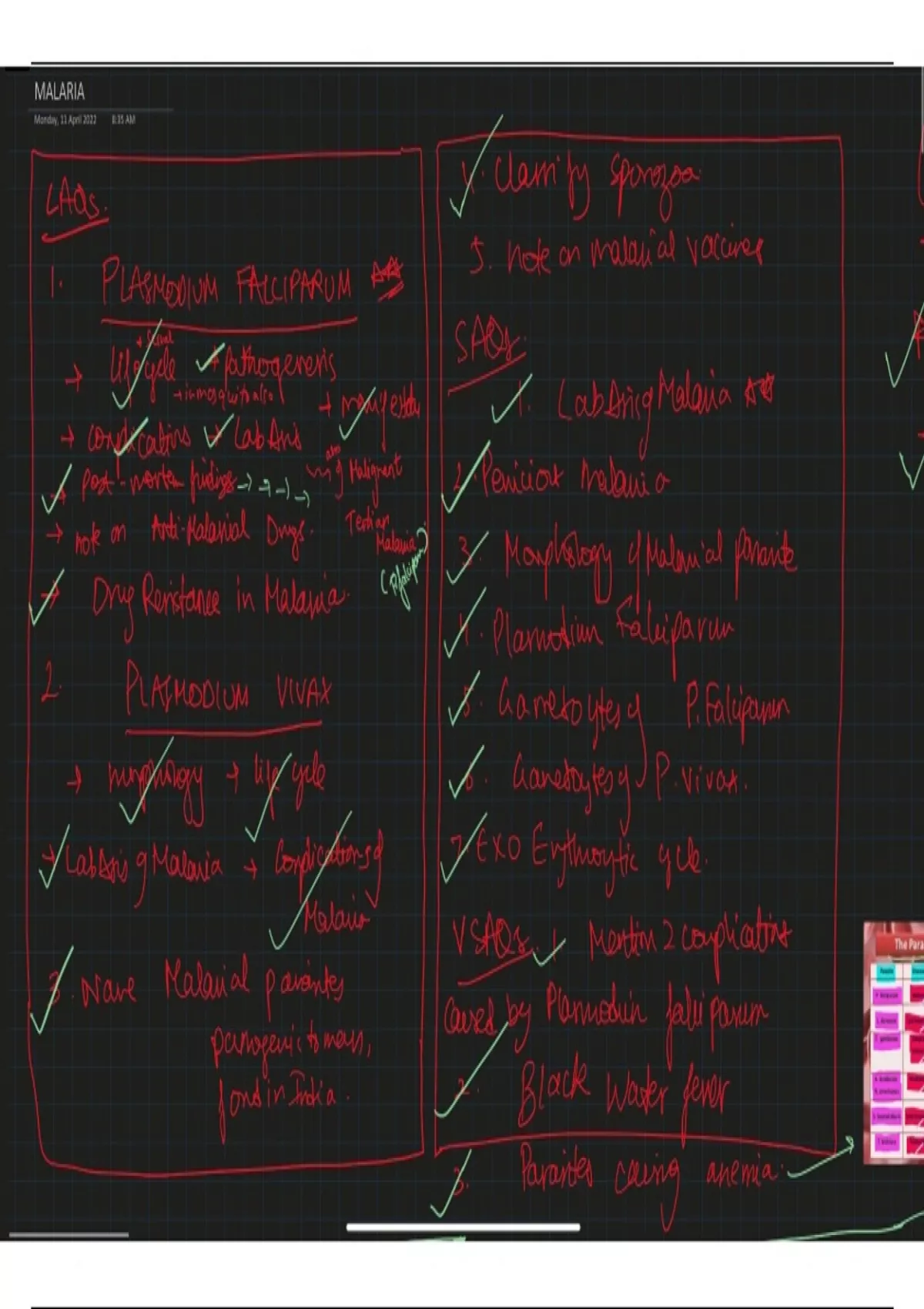 Concise, easy to learn from, visually appealing handwritten notes of MALARIA. Made in the 2nd year of MBBS from video lectures and in real life classes. Sources used were: - my college professor - coaching sources notes - youtube - textbooks - paniker, ananthanarayan, apurba shastry These notes include the questions and answers from the university question bank for malaria in microbiology (parasitology) including the subheadings: - Sporozoa introduction - etiology - vectors - life cycle - schizogony - sporogony - pathogenesis - complications of falciparum malaria - types of malaria - lab diagnosis - characteristic features - treatment of various types of malaria - multi-drug resistance in malaria - prophylaxis - recrudescence vs relapse