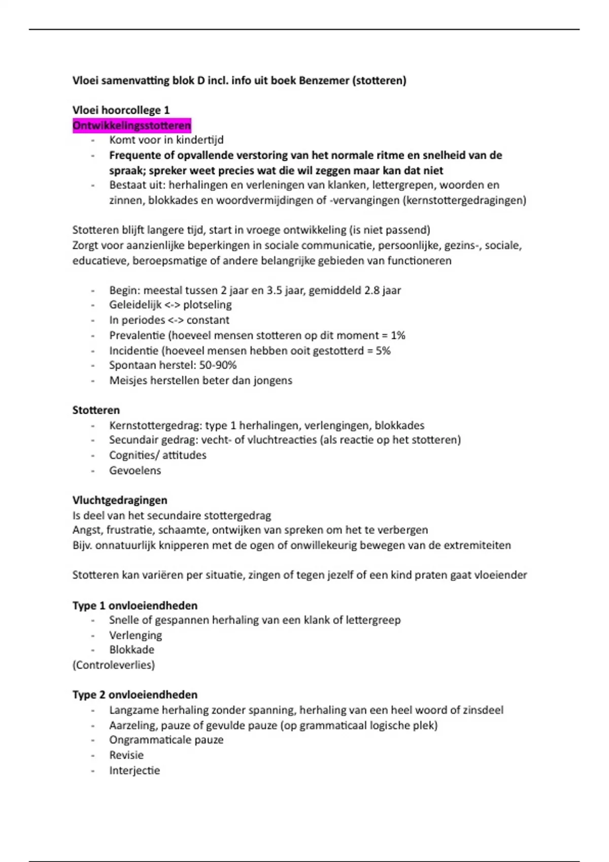 Vloei samenvatting blok D incl. info uit boek Benzemer (stotteren)
