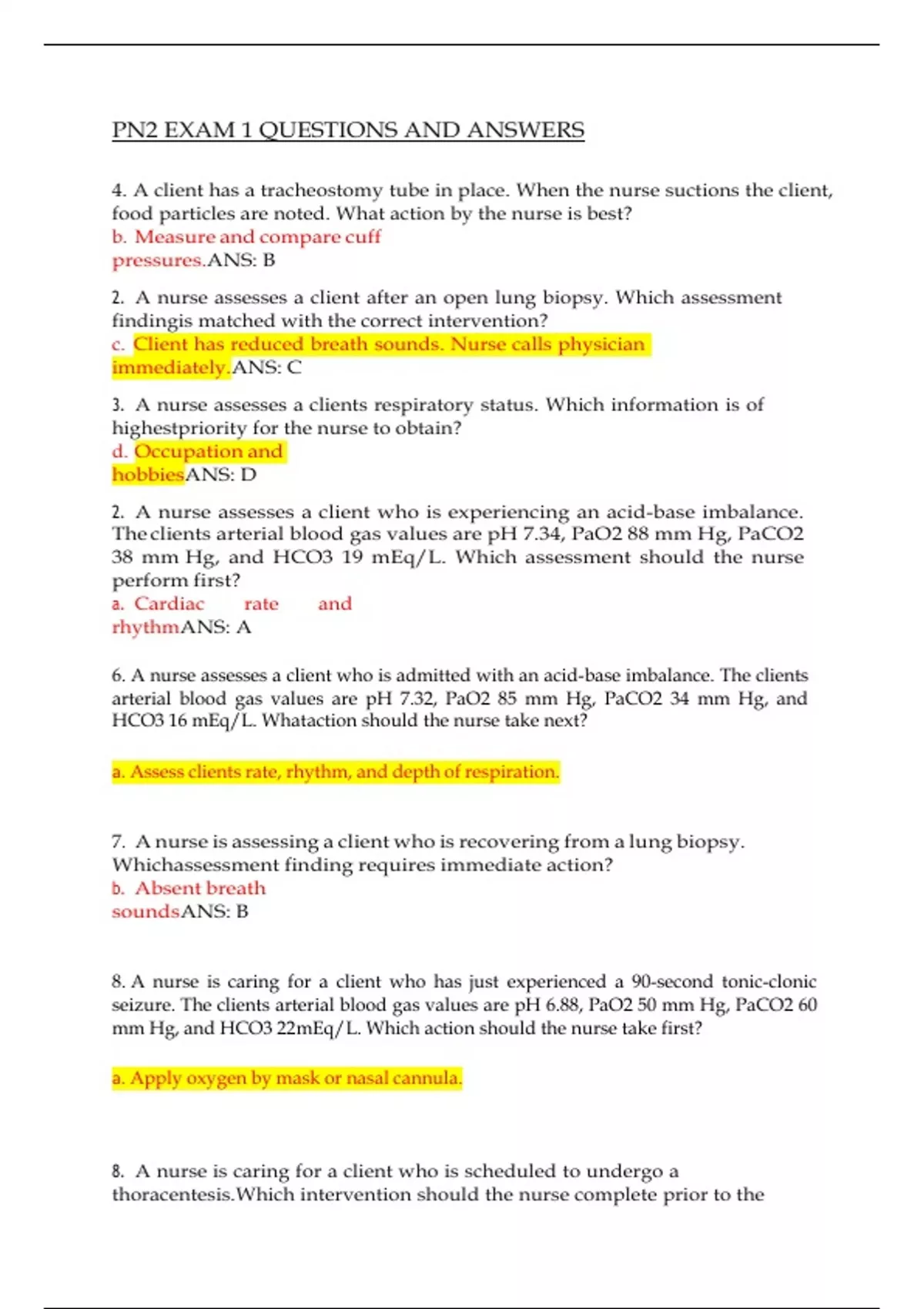 PN2 EXAM 1 QUESTIONS AND ANSWERS.4. A client has a tracheostomy tube in place. When the nurse suctions the client, food particles are noted. What action by the nurse is best? b. Measure and compare cuff pressures. ANS: B 2. A nurse assesses a client after an open lung biopsy. Which assessment finding is matched with the correct intervention? c. Client has reduced breath sounds. Nurse calls physician immediately. ANS: C 3. A nurse assesses a clients respiratory status. Which information is of highest priority for the nurse to obtain? d. Occupation and hobbies ANS: D 2. A nurse assesses a client who is experiencing an acid-base imbalance. The clients arterial blood gas values are pH 7.34, PaO2 88 mm Hg, PaCO2 38 mm Hg, and HCO3 19 mEq/L. Which assessment should the nurse perform first? a. Cardiac rate and rhythm ANS: A 6. A nurse assesses a client who is admitted with an acid-base imbalance. The clients arterial blood gas values are pH 7.32, PaO2 85 mm Hg, PaCO2 34 mm Hg, and HCO3 16 mEq/L. What action should the nurse take next? a. Assess clients rate, rhythm, and depth of respiration. 7. A nurse is assessing a client who is recovering from a lung biopsy. Which assessment finding requires immediate action? b. Absent breath sounds ANS: B 8. A nurse is caring for a client who has just experienced a 90-second tonic-clonic seizure. The clients arterial blood gas values are pH 6.88, PaO2 50 mm Hg, PaCO2 60 mm Hg, and HCO3 22 mEq/L. Which action should the nurse take first? a. Apply oxygen by mask or nasal cannula.