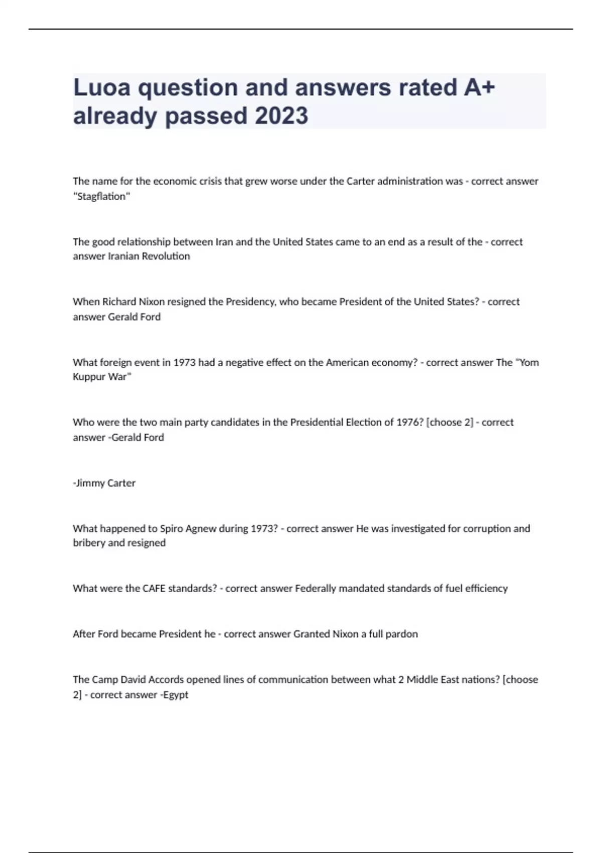 Luoa question and answers rated A+ already passed 2023 The name for the economic crisis that grew worse under the Carter administration was - correct answer "Stagflation" The good relationship between Iran and the United States came to an end as a result of the - correct answer Iranian Revolution When Richard Nixon resigned the Presidency, who became President of the United States? - correct answer Gerald Ford What foreign event in 1973 had a negative effect on the American economy? - correct answer The "Yom Kuppur War" Who were the two main party candidates in the Presidential Election of 1976? [choose 2] - correct answer -Gerald Ford -Jimmy Carter What happened to Spiro Agnew during 1973? - correct answer He was investigated for corruption and bribery and resigned What were the CAFE standards? - correct answer Federally mandated standards of fuel efficiency After Ford became President he - correct answer Granted Nixon a full pardon The Camp David Accords opened lines of communication between what 2 Middle East nations? [choose 2] - correct answer -Egypt