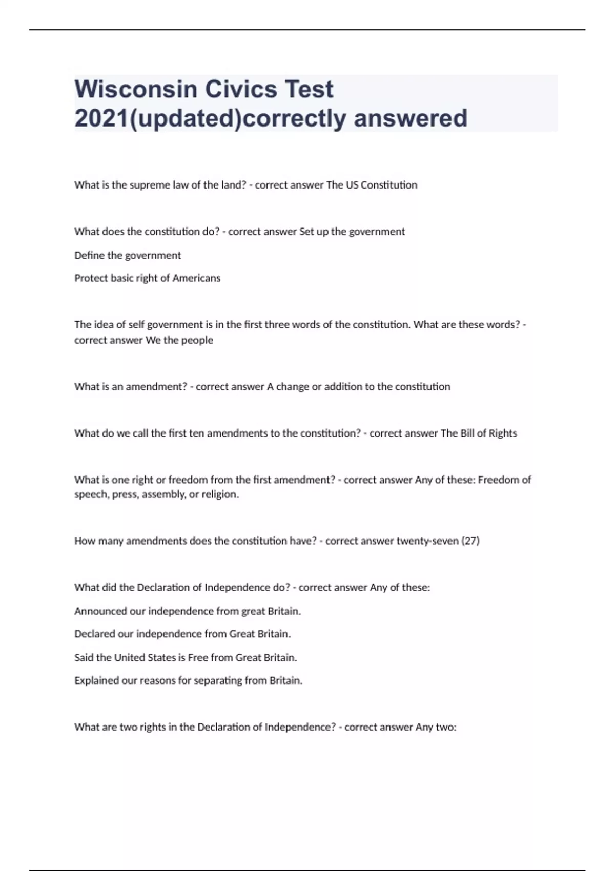 Wisconsin Civics Test 2021(updated)correctly answered What is the supreme law of the land? - correct answer The US Constitution What does the constitution do? - correct answer Set up the government Define the government Protect basic right of Americans The idea of self government is in the first three words of the constitution. What are these words? - correct answer We the people What is an amendment? - correct answer A change or addition to the constitution What do we call the first ten amendments to the constitution? - correct answer The Bill of Rights What is one right or freedom from the first amendment? - correct answer Any of these: Freedom of speech, press, assembly, or religion. How many amendments does the constitution have? - correct answer twenty-seven (27) What did the Declaration of Independence do? - correct answer Any of these: Announced our independence from great Britain. Declared our independence from Great Britain. Said the United States is Free from Great Britain. Explained our reasons for separating from Britain. What are two rights in the Declaration of Independence? - correct answer Any two: