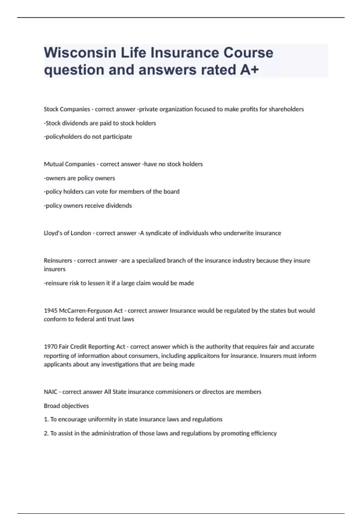Wisconsin Life Insurance Course question and answers rated A+Stock Companies - correct answer -private organization focused to make profits for shareholders -Stock dividends are paid to stock holders -policyholders do not participate Mutual Companies - correct answer -have no stock holders -owners are policy owners -policy holders can vote for members of the board -policy owners receive dividends Lloyd's of London - correct answer -A syndicate of individuals who underwrite insurance Reinsurers - correct answer -are a specialized branch of the insurance industry because they insure insurers -reinsure risk to lessen it if a large claim would be made 1945 McCarren-Ferguson Act - correct answer Insurance would be regulated by the states but would conform to federal anti trust laws 1970 Fair Credit Reporting Act - correct answer which is the authority that requires fair and accurate reporting of information about consumers, including applicaitons for insurance. Insurers must inform applicants about any investigations that are being made NAIC - correct answer All State insurance commisioners or directos are members Broad objectives 1. To encourage uniformity in state insurance laws and regulations 2. To assist in the administration of those laws and regulations by promoting efficiency