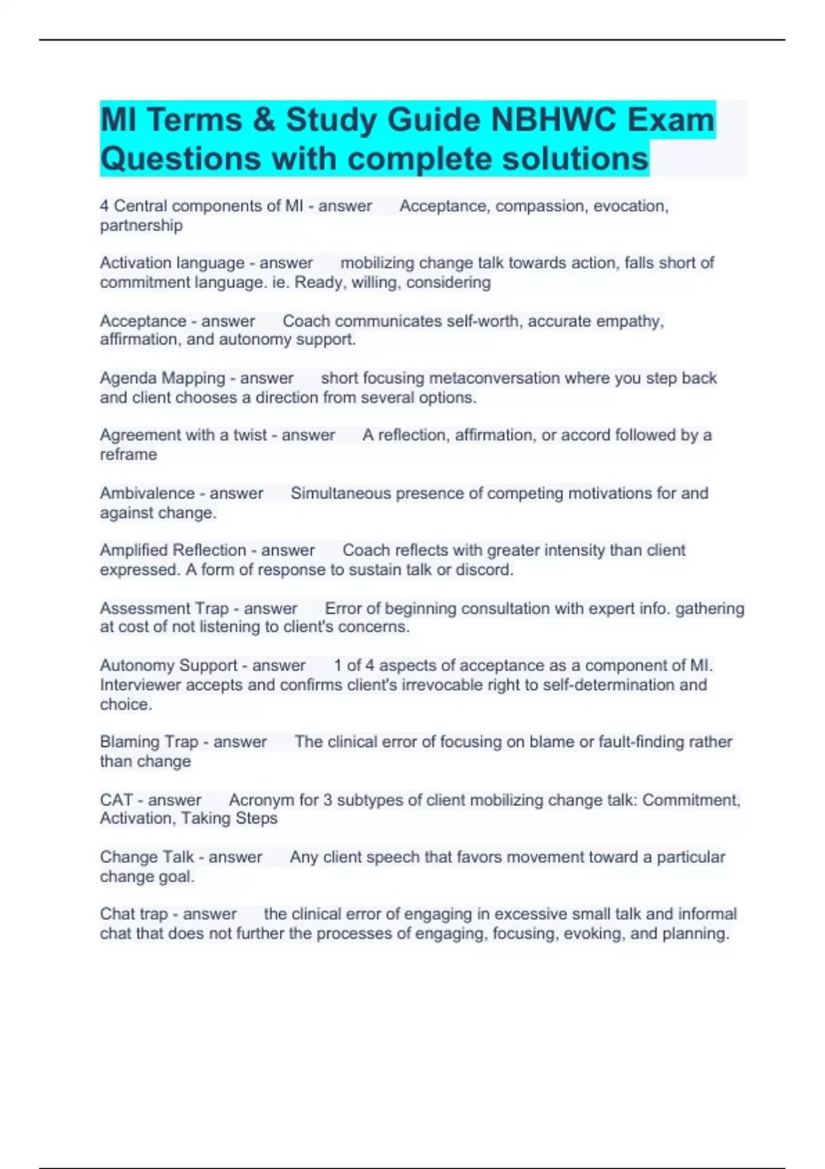MI Terms & Study Guide NBHWC Exam Questions with complete solutions