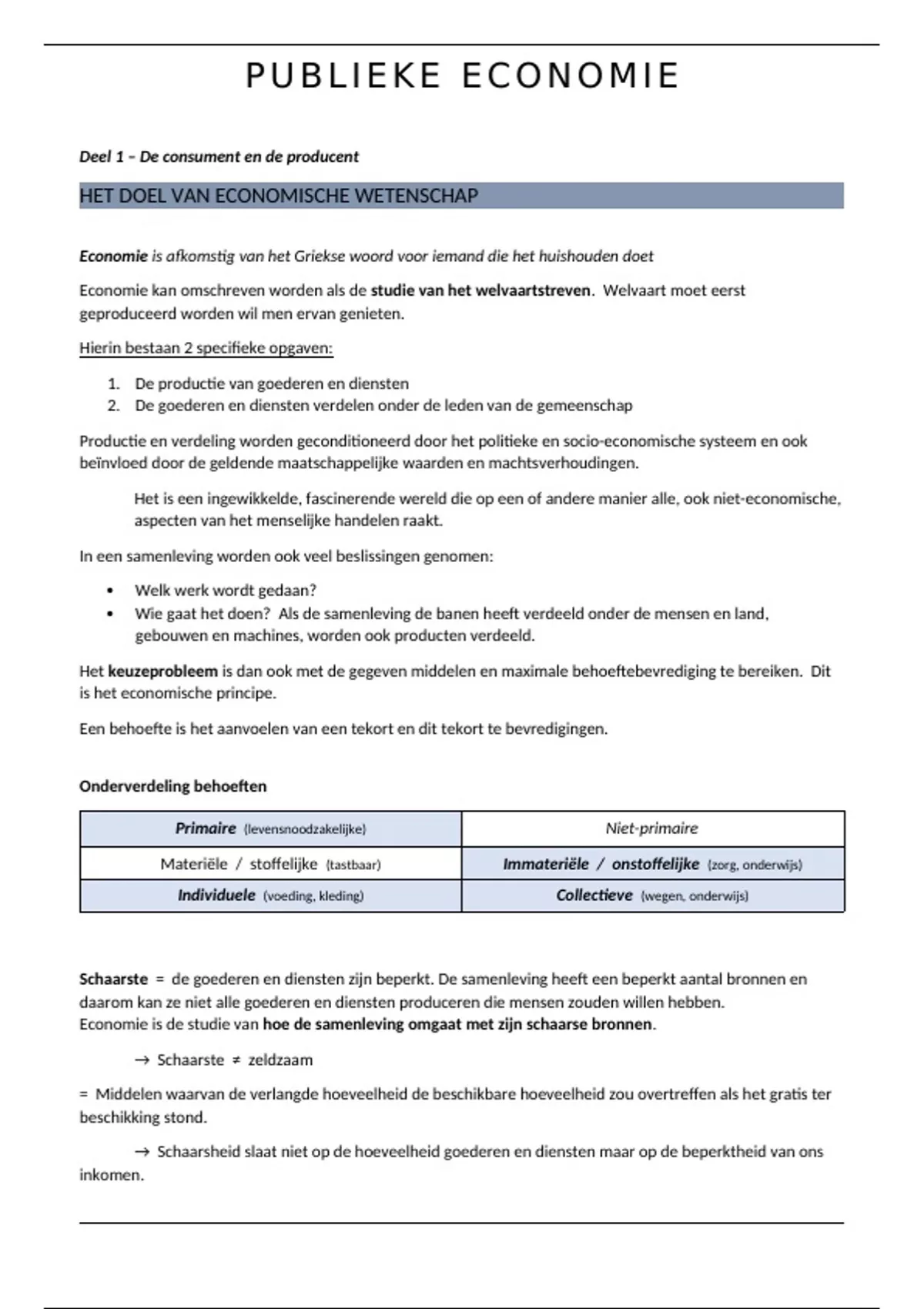 Behoefte = het menselijk verlangen waaraan voldaan wordt door de beschikking over schaarse goederen en
