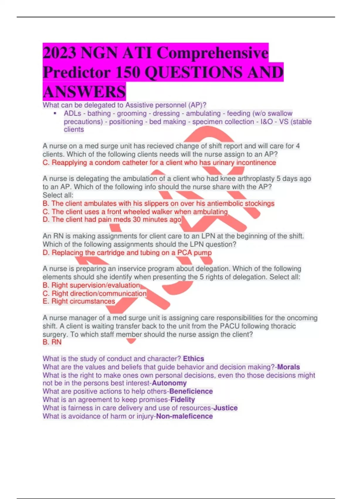 2023 NGN ATI Comprehensive Predictor 150 QUESTIONS AND ANSWERS What can be delegated to Assistive personnel (AP)? ADLs - bathing - grooming - dressing - ambulating - feeding (w/o swallow precautions) - positioning - bed making - specimen collection - I&O - VS (stable clients A nurse on a med surge unit has recieved change of shift report and will care for 4 clients. Which of the following clients needs will the nurse assign to an AP? C. Reapplying a condom catheter for a client who has urinary incontinence A nurse is delegating the ambulation of a client who had knee arthroplasty 5 days ago to an AP. Which of the following info should the nurse share with the AP? Select all: B. The client ambulates with his slippers on over his antiembolic stockings C. The client uses a front wheeled walker when ambulating D. The client had pain meds 30 minutes ago An RN is making assignments for client care to an LPN at the beginning of the shift. Which of the following assignments should the LPN question? D. Replacing the cartridge and tubing on a PCA pump A nurse is preparing an inservice program about delegation. Which of the following elements should she identify when presenting the 5 rights of delegation. Select all: B. Right supervision/evaluation C. Right direction/communication E. Right circumstances A nurse manager of a med surge unit is assigning care responsibilities for the oncoming shift. A client is waiting transfer back to the unit from the PACU following thoracic surgery. To which staff member should the nurse assign the client? B. RN What is the study of conduct and character? Ethics What are the values and beliefs that guide behavior and decision making?-Morals What is the right to make ones own personal decisions, even tho those decisions might not be in the persons best interest-Autonomy What are positive actions to help others-Beneficience What is an agreement to keep promises-Fidelity What is fairness in care delivery and use of resources-Justice What is avoidance of harm or injury-Non-maleficence A nurse is caring for a client who decides not to have surgery despite significant blockages in his coronary arteries. The nurse understands that this clients choice is an example of what principles? A. Fidelity A nurse offers pain meds to a client who is postop prior to ambulation. The nurse understands that this aspect of care delivery is an example of which of the following ethical principles? D. Beneficience-D A nurse is instructing a group of nursing students about the responsibilities involved with organ donation and procurement. When the nurse explains that all clients waiting for a kidney transplant have to meet the same qualifications, the students should understand that this aspect of care delivery is an example of which ethical principle C. Justice A nurse questions a med prescription as too extreme and light of the clients advanced age and unstable status. The nurse understands that this action is an example of which ethical principle D. Nonmalificence Which of the following situations can be identified as an ethical dilemma? C. A family has conflicting feelings about the initiation of enteral tube feedings of their father who is terminally ill Most managers can be categorized as-authoritative, democratic, and laissez faire Authoritative makes decisions of the group motivates by coercion communication occurs down the chain of command Work output by the staff is usually high-good for crisis situations and bureaucratic settings- Democratic includes the group when decisions are made Motivates by supporting star achievements Communication occurs up and down the chain of command Work output by staff is usually of good quality-good when cooperation and collaboration is necessary- Laissez faire makes very few decisions and does little planning motivation is largely the responsibility of individuals staff members Communication occurs up and down the chain of command and between group members Work output is low unless an informal leader evolves from the group *the use of any of these styles may be appropriate depending on the situation- The nurse should consider the hierarchy of human needs when prioritizing interventions, which are?— -Physiological needs first (oxygen, shelter, food) - Safety & security needs (physical safety) - Love and belonging - Self esteem - Self actualization The ABC framework identifies, in order, the three basic needs for sustaining life- Airway Breathing Circulation Nurses must follow what code of standards in delegating and assigning tasks- ANA codes of standards What values would a nurse possess to be a client advocate?- CARE - caring - autonomy - respect - empowerment What do the nurse need to keep in mind about the client when being their advocate?- Client's religion & culture When should planning discharge process begin? a. at time of admission What is an interdisciplinary team?- A group of health care professionals from different disciplines Fill in the blank: 1. collaboration is