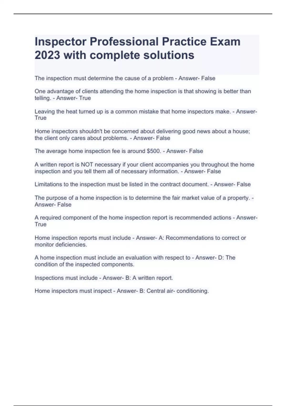 The inspection must determine the cause of a problem - Answer- False One advantage of clients attending the home inspection is that showing is better than telling. - Answer- True Leaving the heat turned up is a common mistake that home inspectors make. - Answer- True Home inspectors shouldn't be concerned about delivering good news about a house; the client only cares about problems. - Answer- False The average home inspection fee is around $500. - Answer- False A written report is NOT necessary if your client accompanies you throughout the home inspection and you tell them all of necessary information. - Answer- False Limitations to the inspection must be listed in the contract document. - Answer- False The purpose of a home inspection is to determine the fair market value of a property. - Answer- False A required component of the home inspection report is recommended actions - Answer- True Home inspection reports must include - Answer- A: Recommendations to correct or monitor deficiencies. A home inspection must include an evaluation with respect to - Answer- D: The condition of the inspected components. Inspections must include - Answer- B: A written report. Home inspectors must inspect - Answer- B: