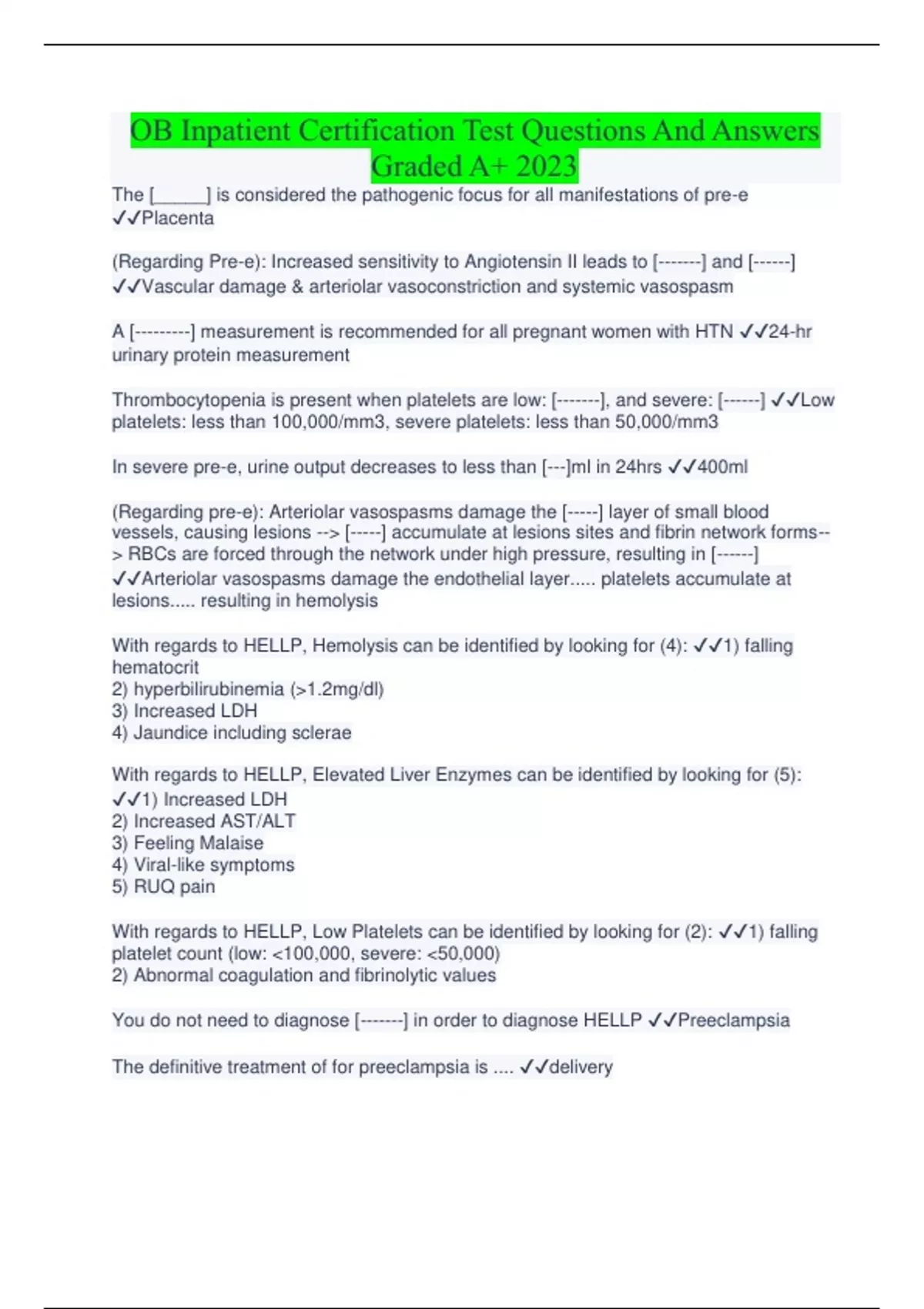 OB Inpatient Certification Test Questions And Answers Graded A+ 2023 The [_____] is considered the pathogenic focus for all manifestations of pre-e Placenta (Regarding Pre-e): Increased sensitivity to Angiotensin II leads to [-------] and [------] Vascular damage & arteriolar vasoconstriction and systemic vasospasm A [---------] measurement is recommended for all pregnant women with HTN 24-hr urinary protein measurement Thrombocytopenia is present when platelets are low: [-------], and severe: [------] Low platelets: less than 100,000/mm3