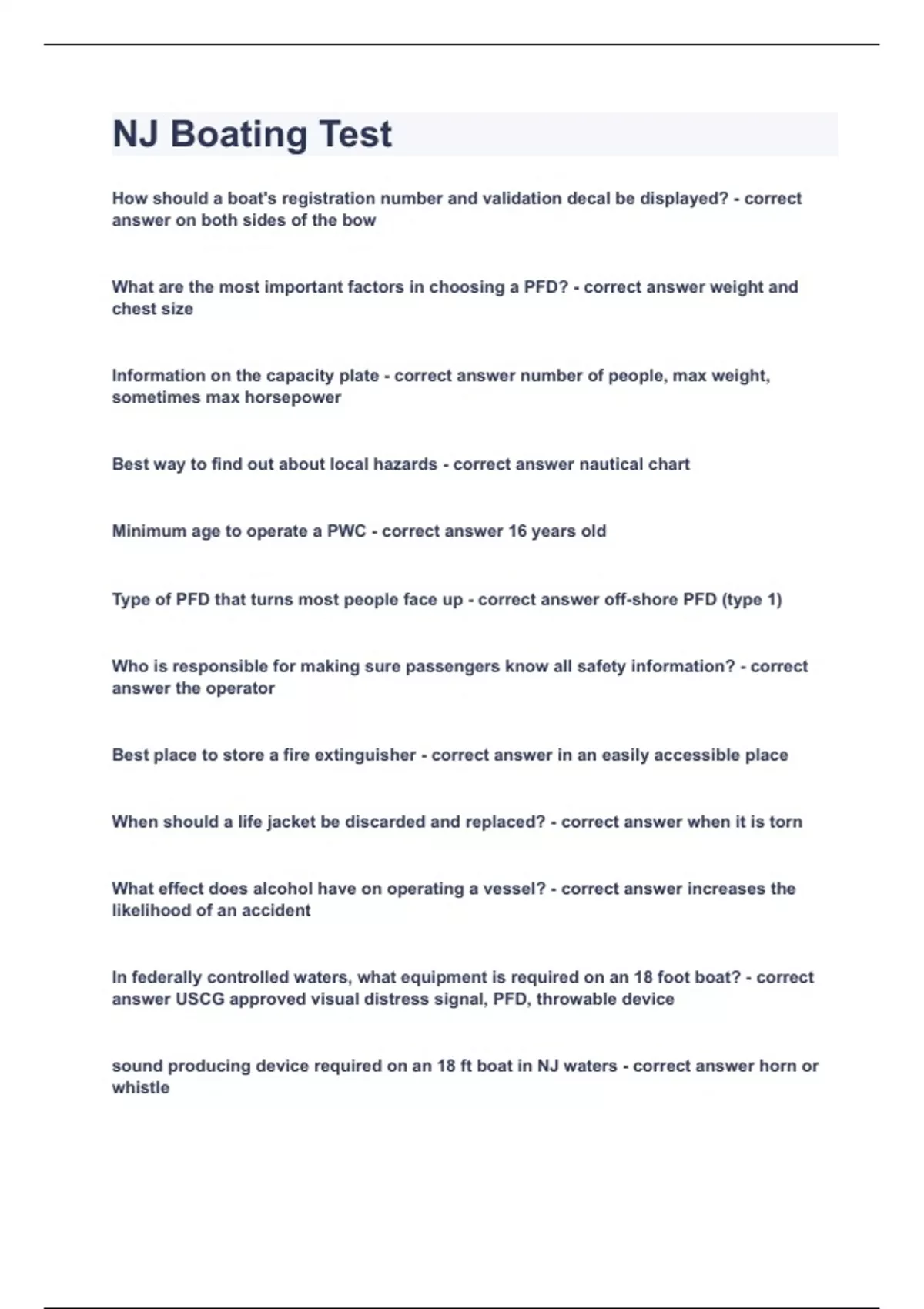 How should a boat's registration number and validation decal be displayed? on both sides of the bow What are the most important factors in choosing a PFD? weight and chest size Information on the capacity plate number of people, max weight, sometimes max horsepower Best way to find out about local hazards nautical chart Minimum age to operate a PWC 16 years old Type of PFD that turns most people face up off-shore PFD (type 1) Who is responsible for making sure passengers know all safety information? the operator Best place to store a fire extinguisher in an easily accessible place When should a life jacket be discarded and replaced? when it is torn What effect does alcohol have on operating a vessel? increases the likelihood of an accident In federally controlled waters, what equipment is required on an 18 foot boat? USCG approved visual distress signal, PFD, throwable device sound producing device required on an 18 ft boat in NJ waters horn or whistle What factors provide warning of dangerous weather? dark clouds and shifting winds part of a regular engine maintenance program check the oil With respect to the wind or current, how should you approach the dock? into the wind What should you do before fueling? stop the engine, close all doors/windows/hatches Where should the trailer be located when loading gear? well away from the dock how to avoid propeller strikes when boarding turn of engine What is a reason why boat operators would be directed to shore? not enough PFDs on board What is the best way of minimizing the risk of drowning? wearing a life jacket how to avoid transporting nuisance species clean hull, clear bilge, clear off zebra mussels boat operator should tell passengers basic safety information and the location of safety equipment function of an ignition safety switch kills the engine if it comes off How far away from a marina, dock, or wharf must a power boat be to travel faster than no wake speed? 200 feet effect of alcohol while boating compared to land greater while boating boating while intoxicated in NJ waters boating in NJ = implied consent for breathilizer