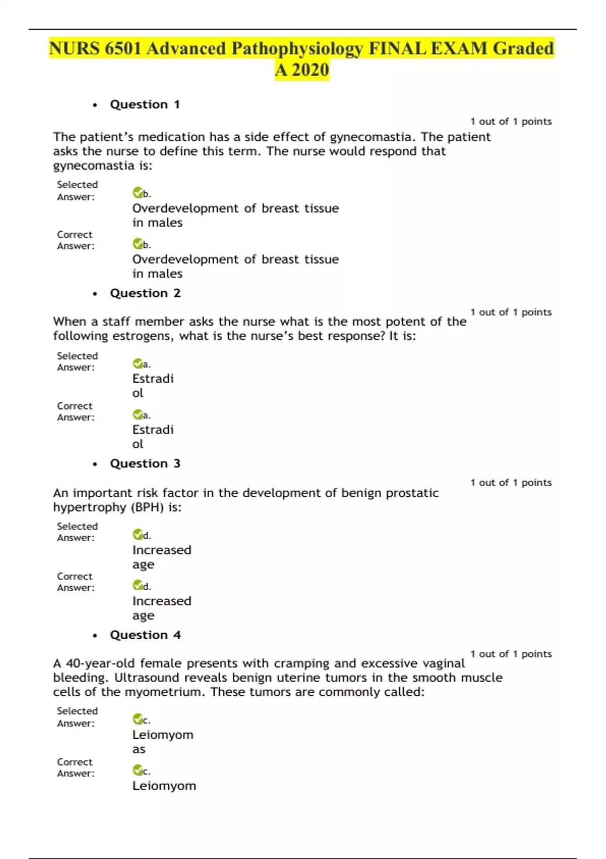 • Question 1 1 out of 1 points The patient’s medication has a side effect of gynecomastia. The patient asks the nurse to define this term. The nurse would respond that gynecomastia is: Selected Answer: Correct Answer: b. Overdevelopment of breast tissue in males b. Overdevelopment of breast tissue in males • Question 2 When a staff member asks the nurse what is the most potent of the following estrogens, what is the nurse’s best response? It is: 1 out of 1 points Selected Answer: Correct Answer: a. Estradi ol a. Estradi ol • Question 3 An important risk factor in the development of benign prostatic hypertrophy (BPH) is: 1 out of 1 points Selected Answer: Correct Answer: d. Increased age d. Increased age • Question 4 A 40-year-old female presents with cramping and excessive vaginal 1 out of 1 points bleeding. Ultrasound reveals benign uterine tumors in the smooth muscle cells of the myometrium. These tumors are commonly called: Selected Answer: Correct Answer: c. Leiomyom as c. Leiomyom as • Question 5 1 out of 1 points What term should the nurse use when discussing male sex hormones collectively? Selected Answer: Correct Answer: d. Androge ns d. Androge ns • Question 6 A 21-year-old female is infected with human papillomavirus (HPV) 1 out of 1 points following unprotected sexual intercourse with a male she recently met. She is now at higher risk of developing which of the following cancers? Selected Answer: Correct Answer: a. Cervic al a. Cervic al • Question 7 A 68-year-old male presents complaining of difficulty having sexual intercourse. He reports that his penis curves during erection. This condition is referred to as: 1 out of 1 points Selected Answer: Correct Answer: d. Peyronie disease d. Peyronie disease • Question 8 A 40-year-old male is concerned about the possibility of