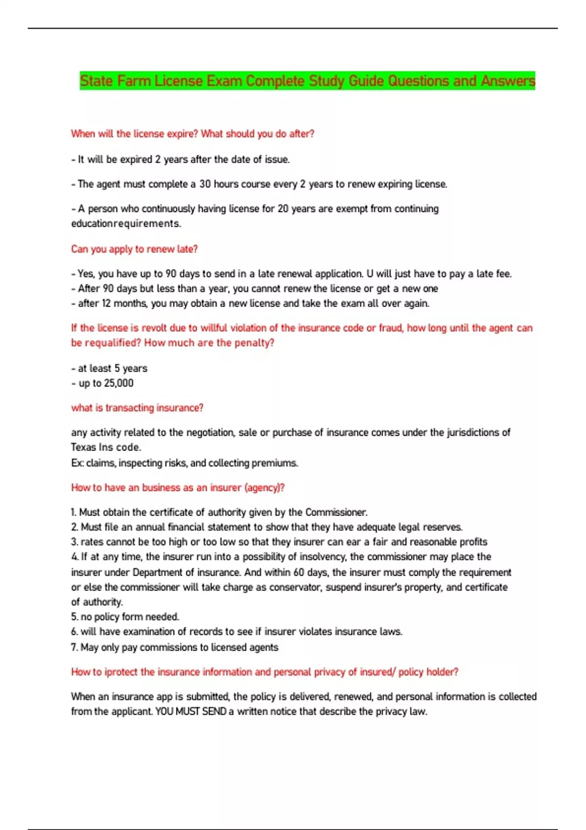 State Farm License Exam Complete Study Guide Questions and Answers (100% Verified Answers) State Farm License Exam Complete Study Guide Questions and Answers When will the license expire? What should you do after? - It will be expired 2 years after the date of issue. - The agent must complete a 30 hours course every 2 years to renew expiring license. - A person who continuously having license for 20 years are exempt from continuing education requirements. Can you apply to renew late? - Yes, you have up to 90 days to send in a late renewal application. U will just have to pay a late fee. - After 90 days but less than a year, you cannot renew the license or get a new one - after 12 months, you may obtain a new license and take the exam all over again. If the license is revolt due to willful violation of the insurance code or fraud, how long until the agent can be requalified? How much are the penalty? - at least 5 years - up to 25,000 what is transacting insurance? any activity related to the negotiation, sale or purchase of insurance comes under the jurisdictions of Texas Ins code. Ex: claims, inspecting risks, and collecting premiums. How to have an business as an insurer (agency)? 1. Must obtain the certificate of authority given by the Commissioner. 2. Must file an annual financial statement to show that they have adequate legal reserves. 3. rates cannot be too high or too low so that they insurer can ear a fair and reasonable profits 4. If at any time, the insurer run into a possibility of insolvency, the commissioner may place the insurer under Department of in ...