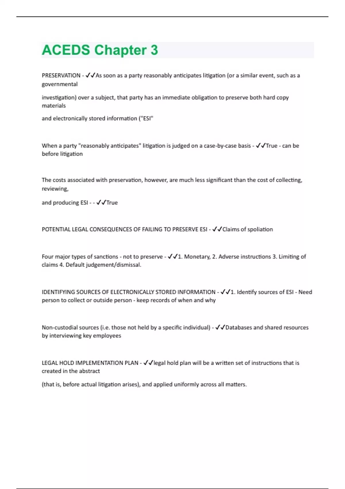 PRESERVATION - As soon as a party reasonably anticipates litigation (or a similar event, such as a governmental investigation) over a subject, that party has an immediate obligation to preserve both hard copy materials and electronically stored information ("ESI" When a party "reasonably anticipates" litigation is judged on a case-by-case basis - True - can be before litigation The costs associated with preservation, however, are much less significant than the cost of collecting, reviewing, and producing ESI - - True POTENTIAL LEGAL CONSEQUENCES OF FAILING TO PRESERVE ESI - Claims of spoliation Four major types of sanctions - not to preserve - 1. Monetary, 2. Adverse instructions 3. Limiting of claims 4. Default judgement/dismissal. IDENTIFYING SOURCES OF ELECTRONICALLY STORED INFORMATION - 1. Identify sources of ESI - Need person to collect or outside person - keep records of when and why Non-custodial sources (i.e. those not held by a specific individual) - Databases and shared resources by interviewing key employees LEGAL HOLD IMPLEMENTATION PLAN - legal hold plan will be a written set of instructions that is created in the abstract (that is, before actual litigation arises), and applied uniformly across all matters.Subject matter: - notice should outline the subject matter of the dispute or investigation that has given