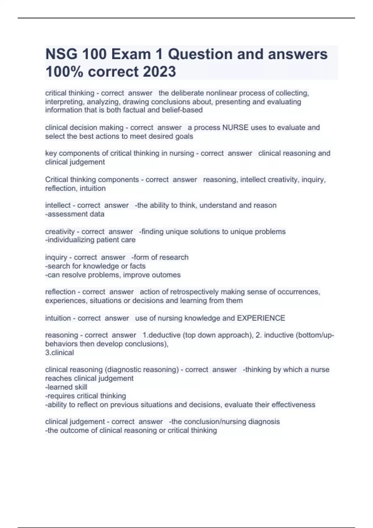 NSG 100 Exam 1 Question and answers 100% correct 2023 critical thinking - correct answer the deliberate nonlinear process of collecting, interpreting, analyzing, drawing conclusions about, presenting and evaluating information that is both factual and belief-based clinical decision making - correct answer a process NURSE uses to evaluate and select the best actions to meet desired goals key components of critical thinking in nursing - correct answer clinical reasoning and clinical judgement Critical thinking components - correct answer reasoning, intellect creativity, inquiry, reflection, intuition intellect - correct answer -the ability to think, understand and reason -assessment data creativity - correct answer -finding unique solutions to unique problems -individualizing patient care inquiry - correct answer -form of research -search for knowledge or facts -can resolve problems, improve outomes reflection - correct answer action of retrospectively making sense of occurrences, experiences, situations or decisions and learning from them intuition - correct answer use of nursing knowledge and EXPERIENCE reasoning - correct answer tive (top down approach), 2. inductive (bottom/up-behaviors then develop conclusions), cal clinical reasoning (diagnostic reasoning) - correct answer -thinking by which a nurse reaches clinical judgement -learned skill -requires critical thinking -ability to reflect on previous situations and decisions, evaluate their effectiveness clinical judgement - correct answer -the conclusion/nursing diagnosis -the outcome of clinical reasoning or critical thinking