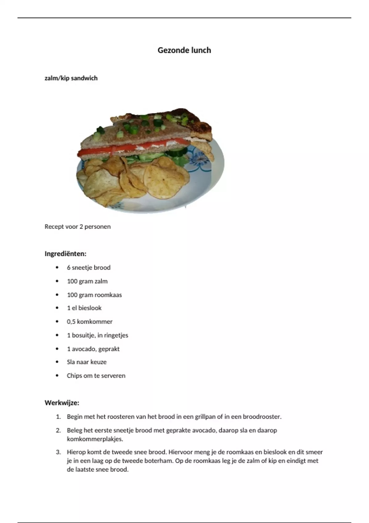 je in een laag op de tweede boterham. Op de roomkaas leg je de zalm of kip en eindigt met