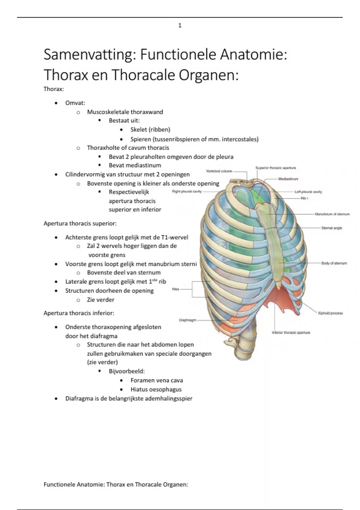 Samenvatting Functionele Anatomie van de Thorax en Thoracale Organen