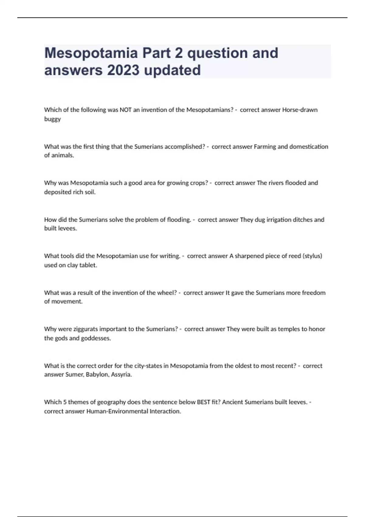 Mesopotamia Part 2 question and answers 2023 updated Which of the following was NOT an invention of the Mesopotamians? - correct answer Horse-drawn buggy What was the first thing that the Sumerians accomplished? - correct answer Farming and domestication of animals. Why was Mesopotamia such a good area for growing crops? - correct answer The rivers flooded and deposited rich soil. How did the Sumerians solve the problem of flooding. - correct answer They dug irrigation ditches and built levees. What tools did the Mesopotamian use for writing. - correct answer A sharpened piece of reed (stylus) used on clay tablet. What was a result of the invention of the wheel? - correct answer It gave the Sumerians more freedom of movement. Why were ziggurats important to the Sumerians? - correct answer They were built as temples to honor the gods and goddesses. What is the correct order for the city-states in Mesopotamia from the oldest to most recent? - correct answer Sumer, Babylon, Assyria. Which 5 themes of geography does the sentence below BEST fit? Ancient Sumerians built leeves. - correct answer Human-Environmental Interaction. Which 5 themes of geography does the sentence BEST fit? Mesopotamia is located near Africa. - correct answer Relative Location. Which 5 themes of geography does the following best fit? Merchants in Babylon traded. - correct answer Movement. In which present-day country is Mesopotamia located? - correct answer Iraq. Which of the following statements BEST describe the purpose of Hammurabi's Code of Law? - correct answer The code was designed to ensure everyone behaved Babylon.
