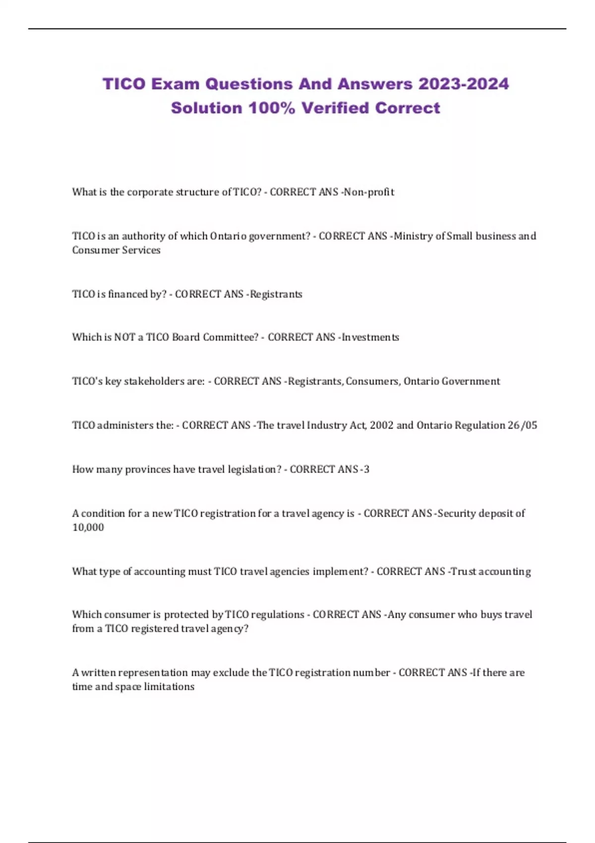 TICO Exam Questions And Answers Solution 100% Verified Correct What is the corporate structure of TICO? - CORRECT ANS -Non-profit TICO is an authority of which Ontario government? - CORRECT ANS -Ministry of Small business and Consumer Services TICO is financed by? - CORRECT ANS -Registrants Which is NOT a TICO Board Committee? - CORRECT ANS -Investments TICO's key stakeholders are: - CORRECT ANS -Registrants, Consumers, Ontario Government TICO administers the: - CORRECT ANS -The travel Industry Act, 2002 and Ontario Regulation 26/05 How many provinces have travel legislation? - CORRECT ANS -3 A condition for a new TICO registration for a travel agency is - CORRECT ANS -Security deposit of 10,000 What type of accounting must TICO travel agencies implement? - CORRECT ANS -Trust accounting Which consumer is protected by TICO regulations - CORRECT ANS -Any consumer who buys travel from a TICO registered travel agency?