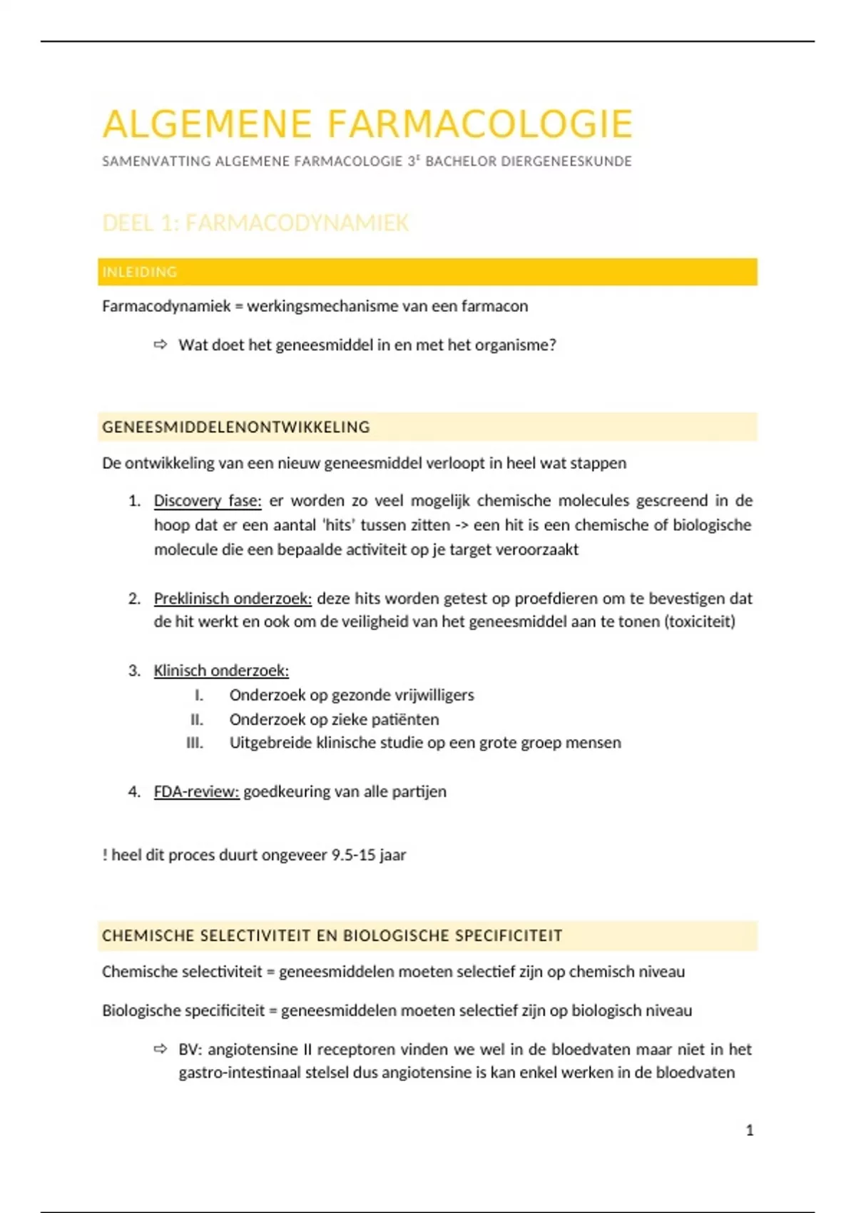 SAMENVATTING ALGEMENE FARMACOLOGIE 3 E BACHELOR DIERGENEESKUNDE