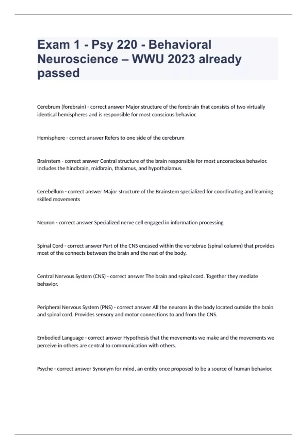 Exam 1 - Psy 220 - Behavioral Neuroscience – WWU 2023 already passedCerebrum (forebrain) Major structure of the forebrain that consists of two virtually identical hemispheres and is responsible for most conscious behavior. Hemisphere Refers to one side of the cerebrum Brainstem Central structure of the brain responsible for most unconscious behavior. Includes the hindbrain, midbrain, thalamus, and hypothalamus. Cerebellum Major structure of the Brainstem specialized for coordinating and learning skilled movements Neuron Specialized nerve cell engaged in information processing Spinal Cord Part of the CNS encased within the vertebrae (spinal column) that provides most of the connects between the brain and the rest of the body.