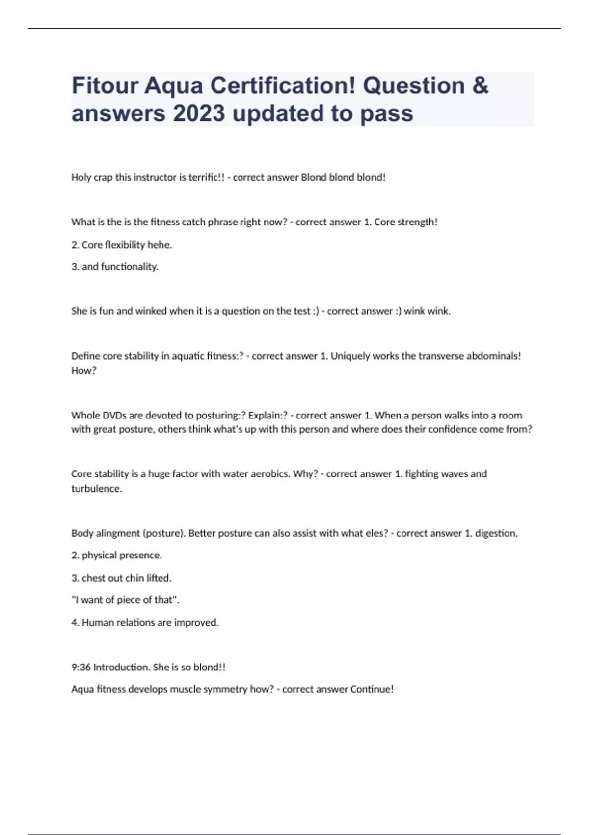 Fitour Aqua Certification! Question & answers 2023 updated to passHoly crap this instructor is terrific!! - correct answer Blond! What is the is the fitness catch phrase right now? - correct answer 1. Core strength! 2. Core flexibility hehe. 3. and functionality. She is fun and winked when it is a question on the test :) - correct answer :) wink wink. Define core stability in aquatic fitness:? - correct answer 1. Uniquely works the transverse abdominals! How? Whole DVDs are devoted to posturing:? Explain:? - correct answer 1. When a person walks into a room with great posture, others think what's up with this person and where does their confidence come from? Core stability is a huge factor with water aerobics. Why? - correct answer 1. fighting waves and turbulence. Body alingment (posture). Better posture can also assist with what eles? - correct answer 1. digestion. 2. physical presence. 3. chest out chin lifted. "I want of piece of that". 4. Human relations are improved. 9:36 Introduction. She is so blond!! Aqua fitness develops muscle symmetry how? - correct answer Continue!