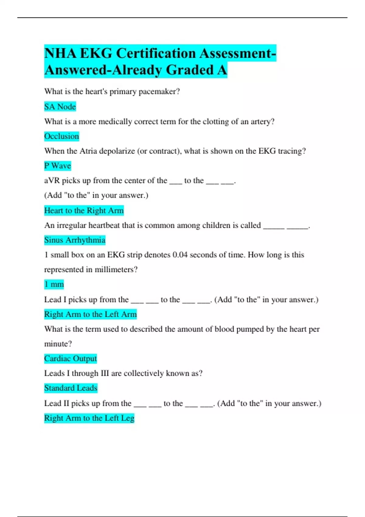 NHA EKG Certification Assessment-Answered-Already Graded A What is the heart's primary pacemaker? SA Node What is a more medically correct term for the clotting of an artery? Occlusion When the Atria depolarize (or contract), what is shown on the EKG tracing? P Wave aVR picks up from the center of the ___ to the ___ ___. (Add "to the" in your answer.) Heart to the Right Arm An irregular heartbeat that is common among children is called _____ _____. Sinus Arrhythmia 1 small box on an EKG strip denotes 0.04 seconds of time. How long is this represented in millimeters? 1 mm Lead I picks up from the ___ ___ to the ___ ___. (Add "to the" in your answer.) Right Arm to the Left Arm What is the term used to described the amount of blood pumped by the heart per minute? Cardiac Output Leads I through III are collectively known as? Standard Leads Lead II picks up from the ___ ___ to the ___ ___. (Add "to the" in your answer.) Right Arm to the Left Leg Leads V1 through V6 are collectively known as (Hint: Chest) Precordial Leads What is the main artery in the arterial system? (Hint: It carries oxygenated blood to the heart and other parts of the body.) Aorta aVL picks up from the center of the ___ to the ___ ___. (Add "to the" in your answer.) Heart to the Left Arm aVR, aVL, and aVF are collectively known as? Augmented Leads Lead III picks up from the ___ ___ to the ___ ___. (Add "to the" in your answer.) Left Arm to the Left Leg Leg electrodes are only used for? Grounding aVF picks up from the center of the ___ to the ___ ___.