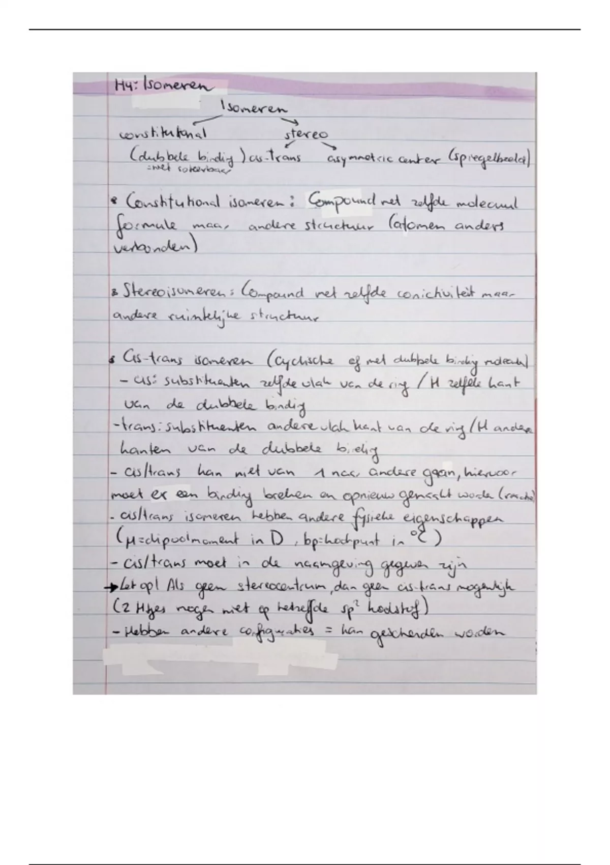 Handgeschreven samenvatting Organische Chemie van H4 t/m H8 (deel II). 1ste zit geslaagd. ----- Inhoud: H4: Isomeren (p1-p5). H5: Alkenen (p6-p7). H6: Reacties van alkenen (p8-p14). H7: Reacties van alkynen (p15-p19). H8: Elektronen delocalisatie (p20-p26). ----- Voor dit samenvatting werd gebruik gemaakt van PowerPoint slides die overeenkomen met het boek 'Organic Chemistry (8th edition) - Paula Yurkanis Bruice' en eigen gemaakte notities uit hoorcolleges. ----- Highlight betekenis: -Paars: hoofdstuk naam -Blauw: omcirkelde reactiemechanisme -Oranje: reactie pijl