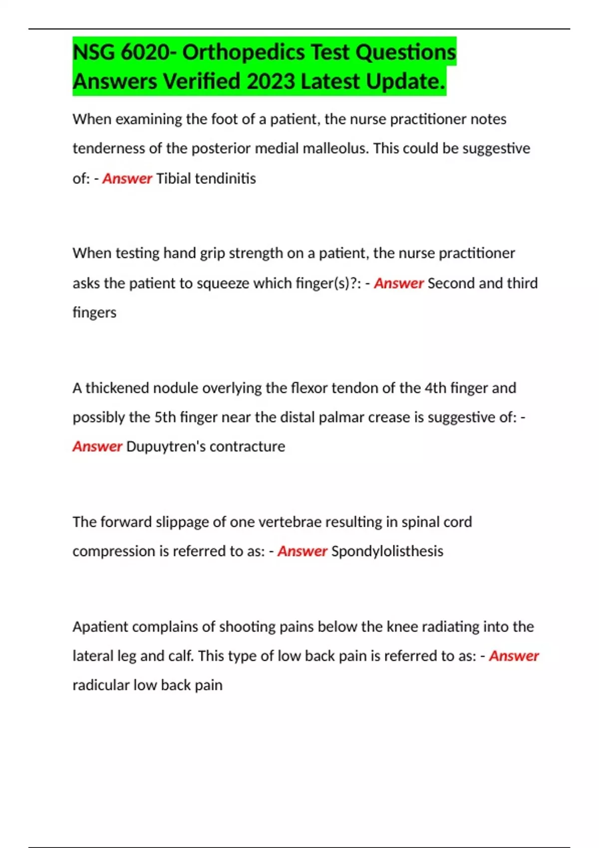 NSG 6020- Orthopedics Test Questions Answers Verified 2023 Latest Update.