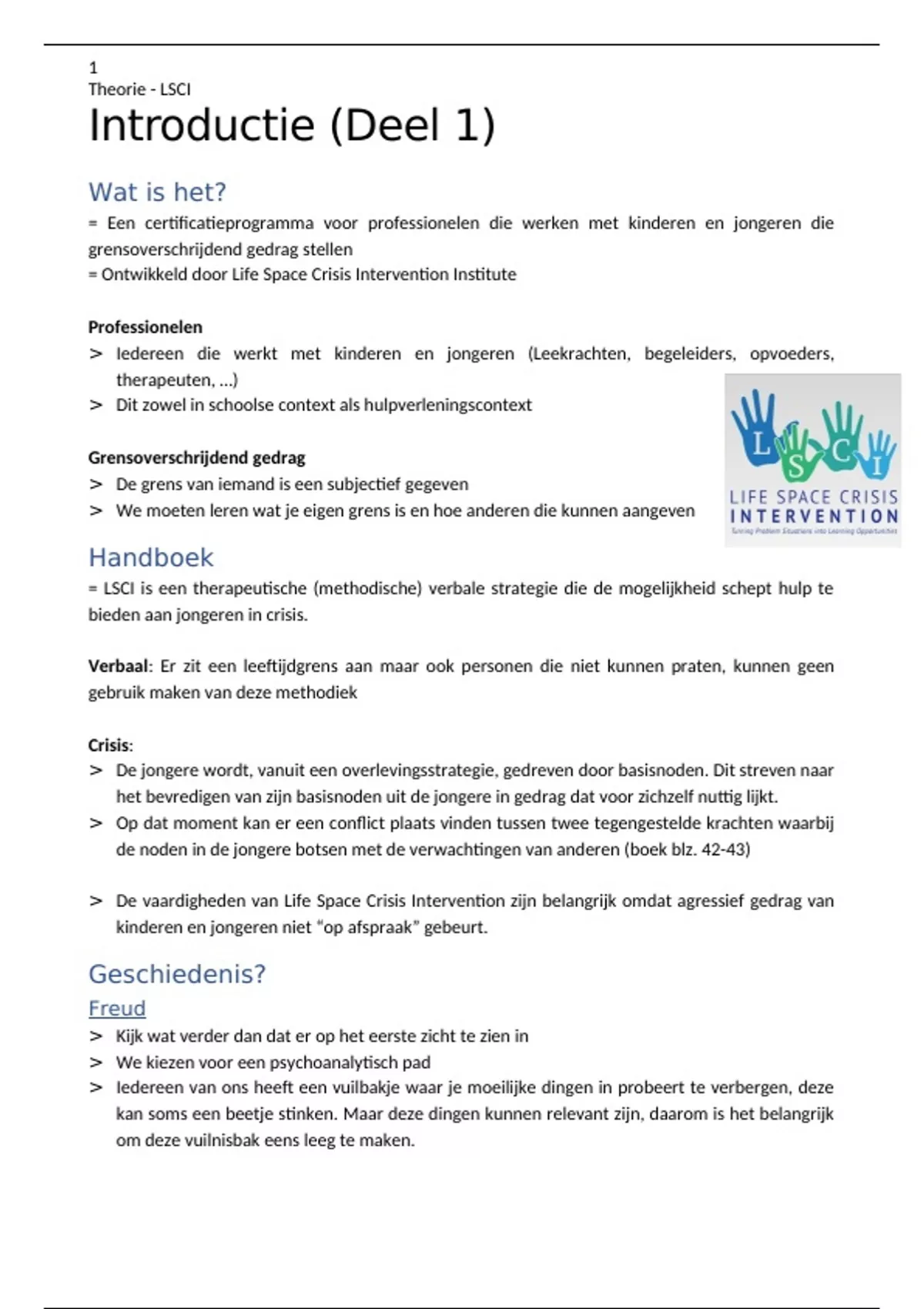 Samenvatting het onderdeel LSCI van het opleidingsonderdeel Jeugd)criminologie en psychopathologie (QE1421) van de professionele bachelor Orthopedagogie van de UCLL te Hasselt. In deze samenvatting vind je de informatie uit de online hoorcolleges van LSCI, aangevuld met afbeeldingen en informatie uit de PowerPoints en eigen aanvullend opzoekwerk.