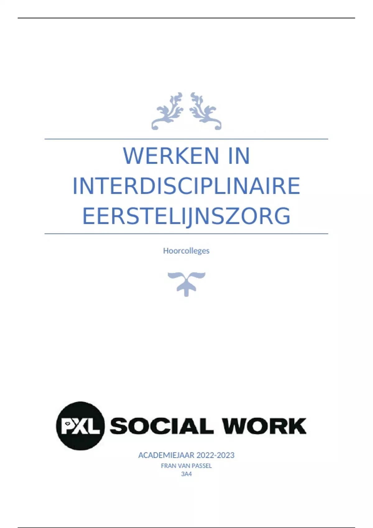 Samenvatting van de Online hoorcolleges van het opleidingsonderdeel Interdisciplinaire Eerstelijnszorg (93SMW3100) ook wel 'Werken in interdisciplinaire context' genoemd. Van de professionele bachelor Sociaal werk (Afstudeerrichting Maatschappelijk werk) van de PXL te Hasselt. De samenvatting is een combinatie van informatie uit de online hoorcolleges en afbeeldingen uit de PowerPoints. Er staan examentips en mogelijke examenvragen in. Tekst gemarkeerd in geel of bijschrift in het rood, duid belangrijke stukken aan.