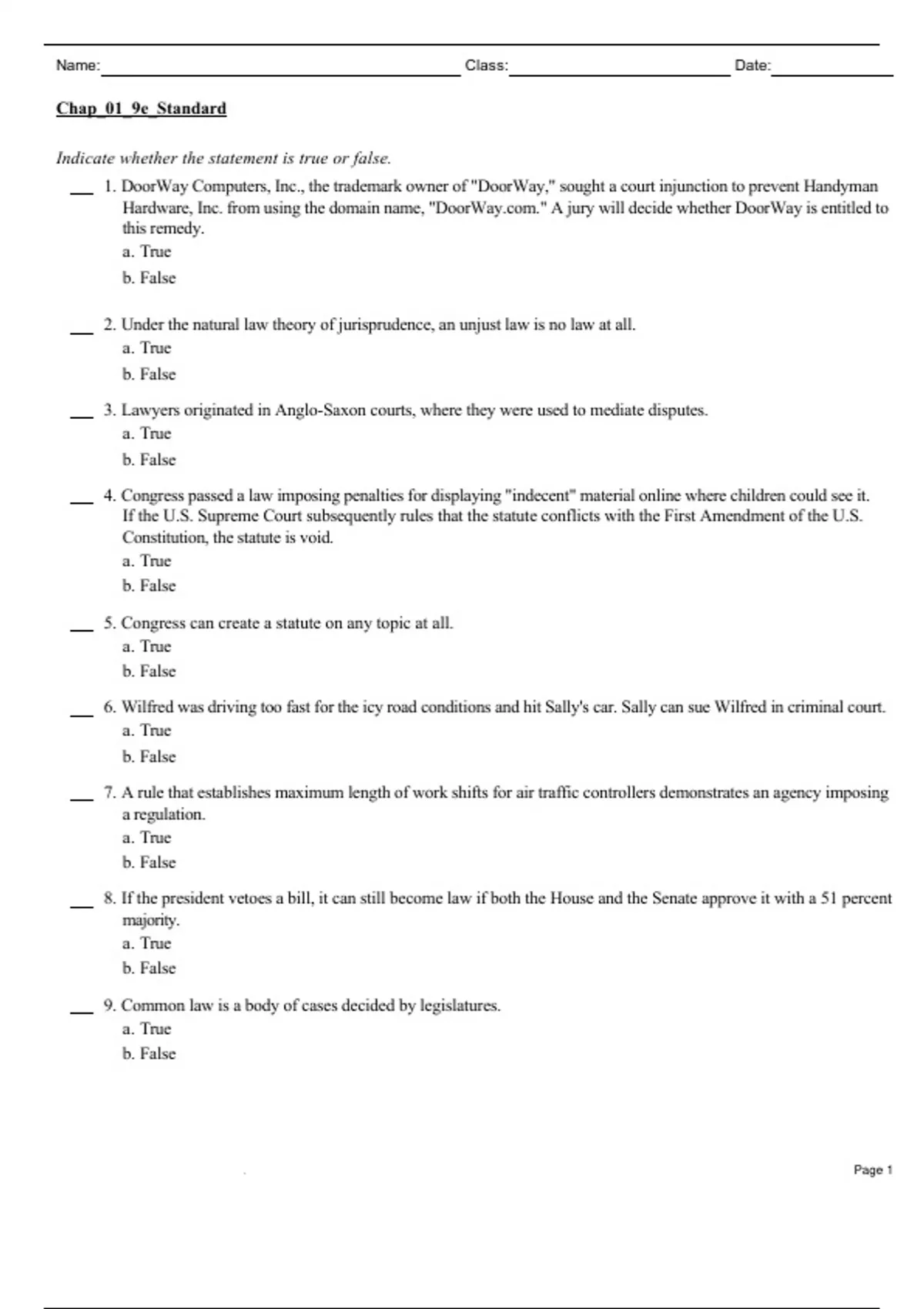 6. Wilfred was driving too fast for the icy road conditions and hit Sally's car. Sally can sue Wilfred in criminal court.