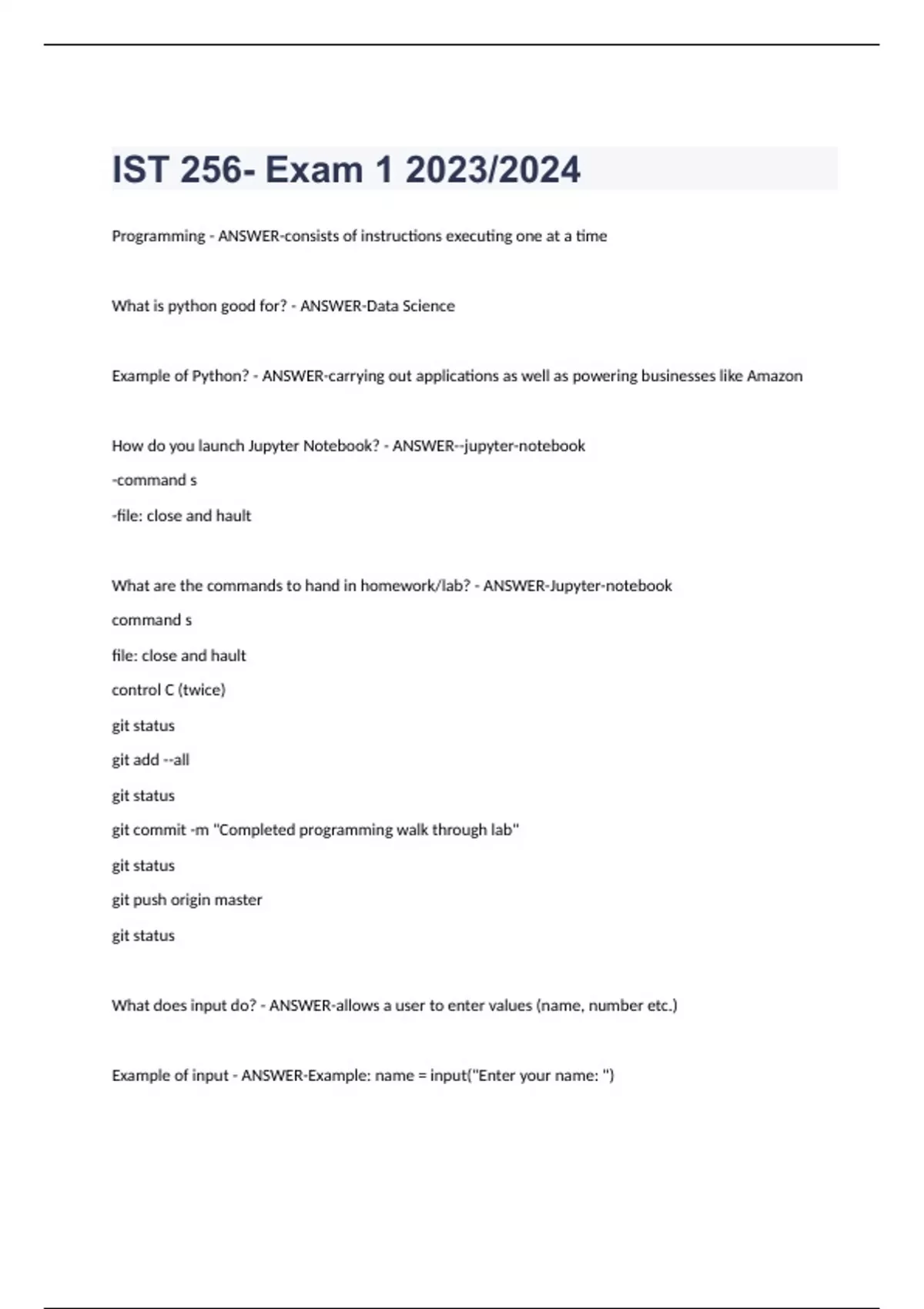 IST 256- Exam 1 2023/2024 Programming - ANSWER-consists of instructions executing one at a time What is python good for? - ANSWER-Data Science Example of Python? - ANSWER-carrying out applications as well as powering businesses like Amazon How do you launch Jupyter Notebook? - ANSWER--jupyter-notebook -command s -file: close and hault What are the commands to hand in homework/lab? - ANSWER-Jupyter-notebook command s file: close and hault control C (twice) git status git add --all git status git commit -m "Completed programming walk through lab" git status git push origin master git status What does input do? - ANSWER-allows a user to enter values (name, number etc.) Example of input - ANSWER-Example: name = input("Enter your name: ")