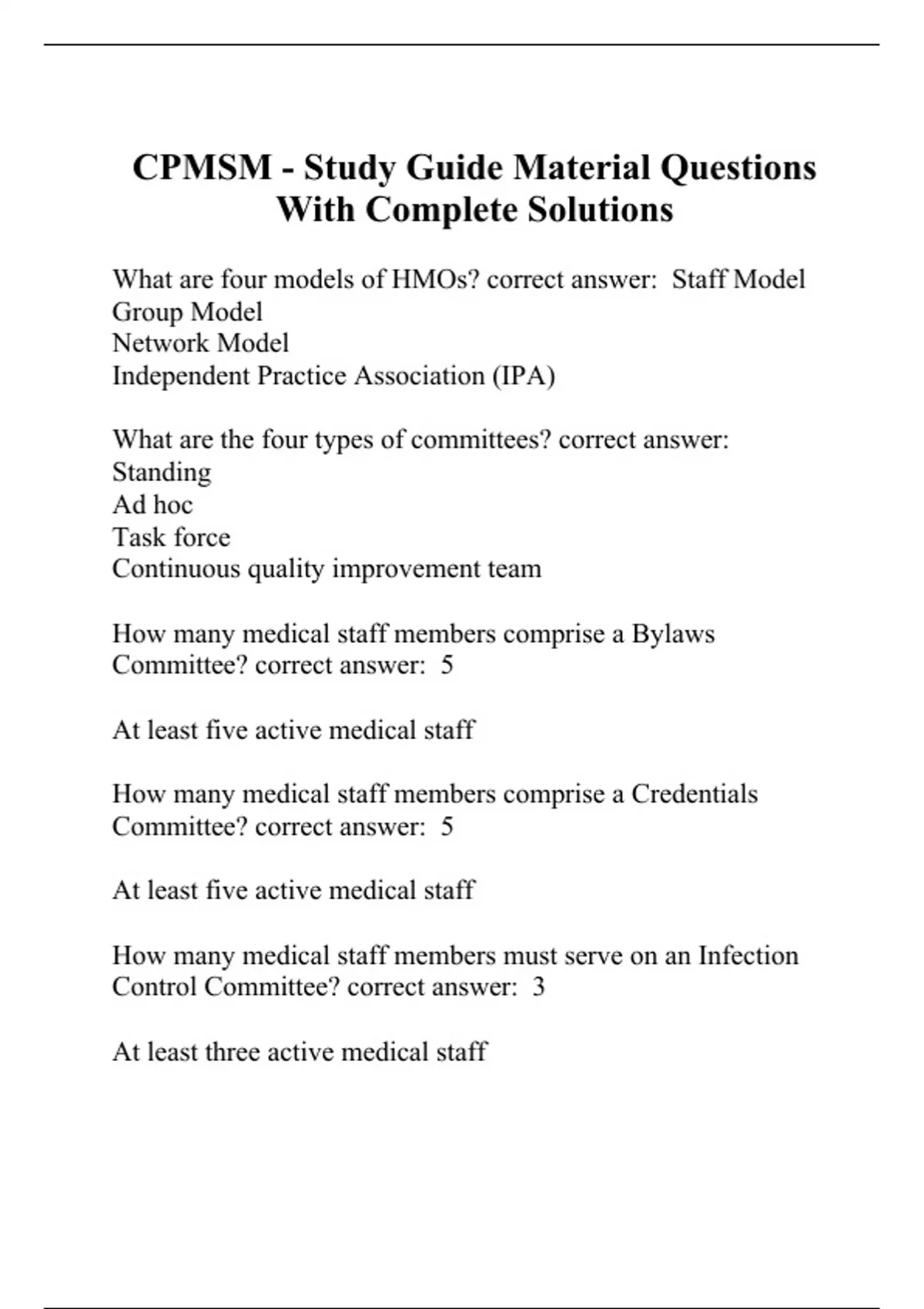 What are four models of HMOs? correct answer: Staff Model Group Model Network Model Independent Practice Association (IPA) What are the four types of committees? correct answer: Standing Ad hoc Task force Continuous quality improvement team How many medical staff members comprise a Bylaws Committee? correct answer: 5 At least five active medical staff How many medical staff members comprise a Credentials Committee? correct answer: 5 At least five active medical staff How many medical staff members must serve on an Infection Control Committee? correct answer: 3 At least three active medical staff How many medical staff members must serve on a Medical Records Committee? correct answer: 1