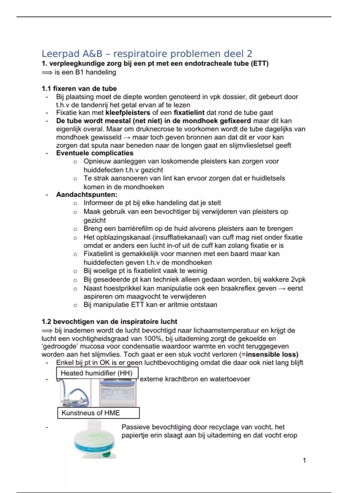 1. verpleegkundige zorg bij een pt met een endotracheale tube (ETT)