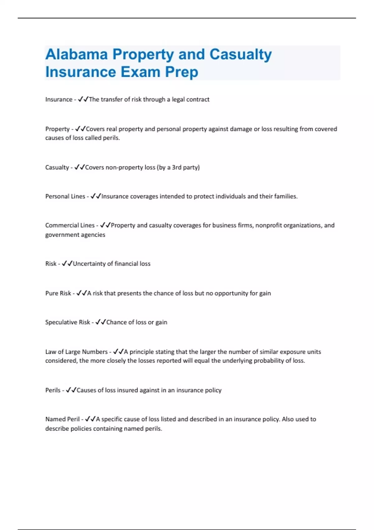 Insurance - The transfer of risk through a legal contract Property - Covers real property and personal property against damage or loss resulting from covered causes of loss called perils. Casualty - Covers non-property loss (by a 3rd party) Personal Lines - Insurance coverages intended to protect individuals and their families. Commercial Lines - Property and casualty coverages for business firms, nonprofit organizations, and government agencies Risk - Uncertainty of financial loss Pure Risk - A risk that presents the chance of loss but no opportunity for gain Speculative Risk - Chance of loss or gain Law of Large Numbers - A principle stating that the larger the number of similar exposure units considered, the more closely the losses reported will equal the underlying probability of loss. Perils - Causes of loss insured against in an insurance policy Named Peril - A specific cause of loss listed and described in an insurance policy. Also used to describe policies containing named perils.Open Perils - Insurance that covers all perils except those specifically noted as excluded