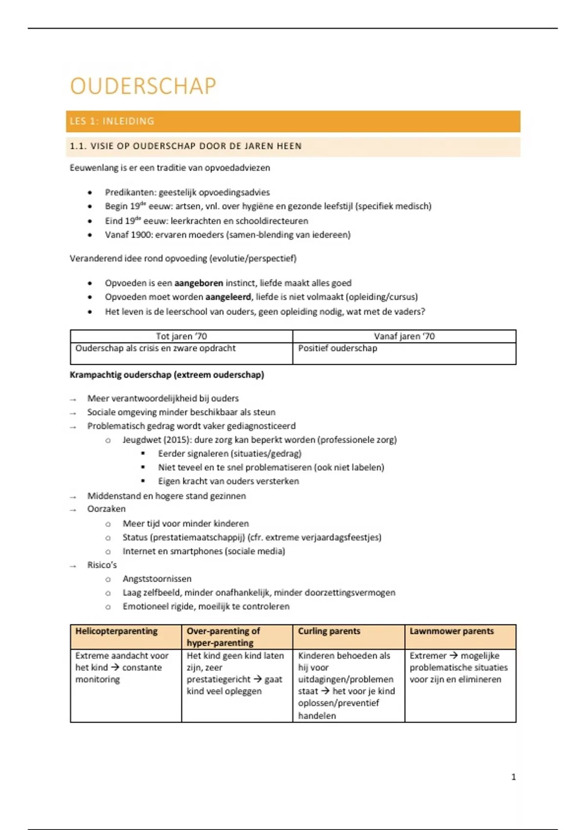 Samenvatting vak Ouderschap, eerste zit erdoor, notities uit lessen + boek geïntegreerd in samenvatting