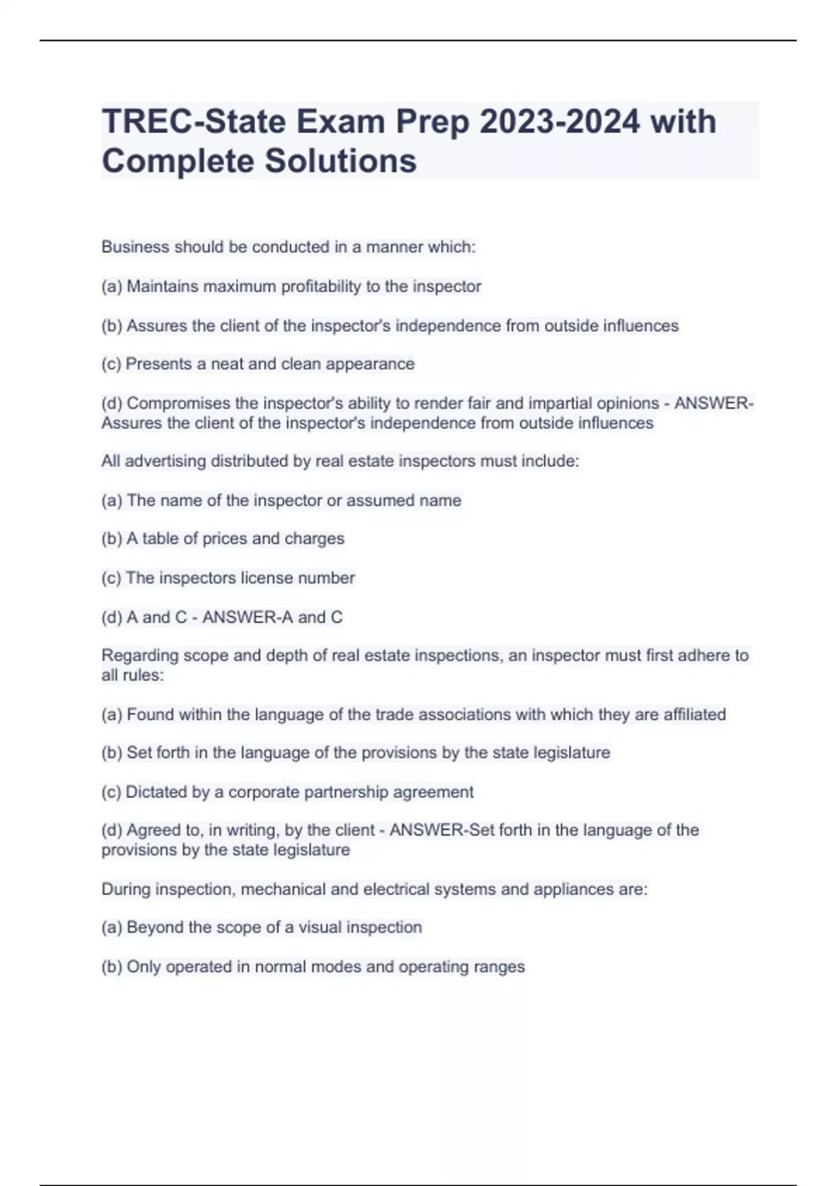 TREC-State Exam Prep with Complete SolutionsTREC-State Exam Prep with Complete SolutionsTREC-State Exam Prep with Complete Solutions Business should be conducted in a manner which: (a) Maintains maximum profitability to the inspector (b) Assures the client of the inspector's independence from outside influences (c) Presents a neat and clean appearance (d) Compromises the inspector's ability to render fair and impartial opinions - ANSWER-Assures the client of the inspector's independence from outside influences All advertising distributed by real estate inspectors must include: (a) The name of the inspector or assumed name (b) A table of prices and charges (c) The inspectors license number (d) A and C - ANSWER-A and C Regarding scope and depth of real estate inspections, an inspector must first adhere to all rules: (a) Found within the language of the trade associations with which they are affiliated (b) Set forth in the language of the provisions by the state legislature (c) Dictated by a corporate partnership agreement (d) Agreed to, in writing, by the client - ANSWER-Set forth in the language of the provisions by the state legislature During inspection, mechanical and electrical systems and appliances are: (a) Beyond the scope of a visual inspection (b) Only operated in normal modes and operating ranges