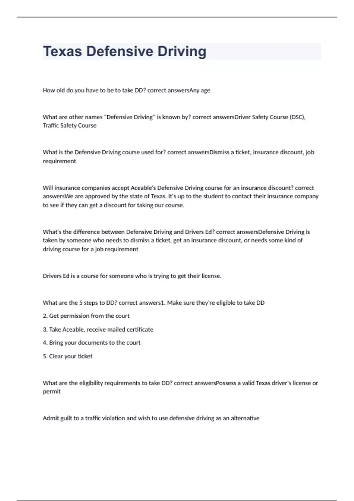 How old do you have to be to take DD? correct answersAny age What are other names "Defensive Driving" is known by? correct answersDriver Safety Course (DSC), Traffic Safety Course What is the Defensive Driving course used for? correct answersDismiss a ticket, insurance discount, job requirement Will insurance companies accept Aceable's Defensive Driving course for an insurance discount? correct answersWe are approved by the state of Texas. It's up to the student to contact their insurance company to see if they can get a discount for taking our course. What's the difference between Defensive Driving and Drivers Ed? correct answersDefensive Driving is taken by someone who needs to dismiss a ticket, get an insurance discount, or needs some kind of driving course for a job requirement Drivers Ed is a course for someone who is trying to get their license. What are the 5 steps to DD? correct answers1. Make sure they're eligible to take DD 2. Get permission from the court 3. Take Aceable, receive mailed certificate 4. Bring your documents to the court 5. Clear your ticket What are the eligibility requirements to take DD? correct answersPossess a valid Texas driver's license or permit Admit guilt to a traffic violation and wish to use defensive driving as an alternative