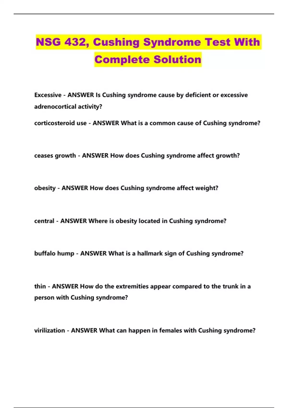 NSG 432, Cushing Syndrome Test With Complete Solution...