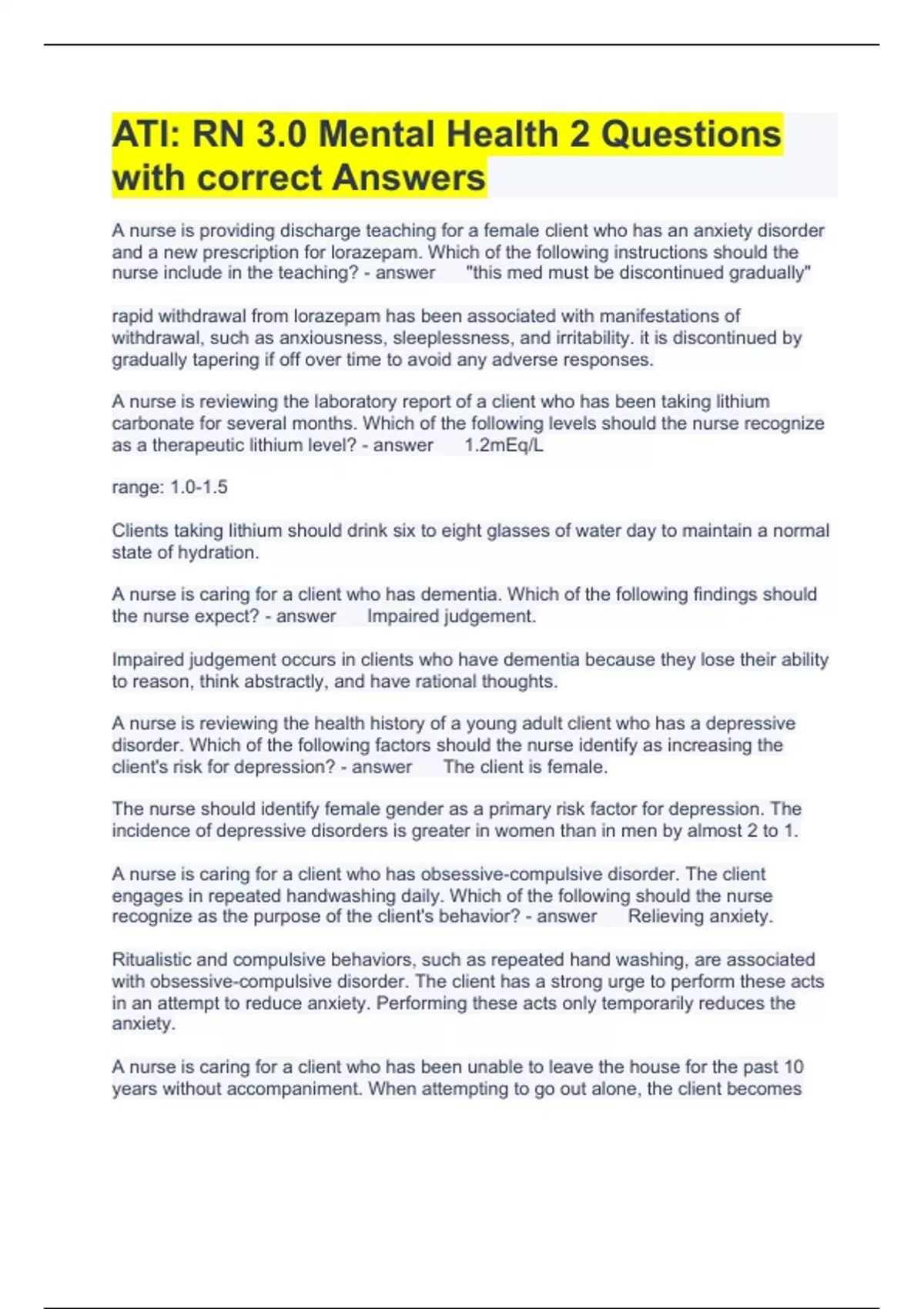 ATI: RN 3.0 Mental Health 2 Questions with correct Answers A nurse is providing discharge teaching for a female client who has an anxiety disorder and a new prescription for lorazepam. Which of the following instructions should the nurse include in the teaching? "this med must be discontinued gradually" rapid withdrawal from lorazepam has been associated with manifestations of withdrawal, such as anxiousness, sleeplessness, and irritability. it is discontinued by gradually tapering if off over time to avoid any adverse responses. A nurse is reviewing the laboratory report of a client who has been taking lithium carbonate for several months. Which of the following levels should the nurse recognize as a therapeutic lithium level? 1.2mEq/L range: 1.0-1.5 Clients taking lithium should drink six to eight glasses of water day to maintain a normal state of hydration. A nurse is caring for a client who has dementia. Which of the following findings should the nurse expect? Impaired judgement. Impaired judgement occurs in clients who have dementia because they lose their ability to reason, think abstractly, and have rational thoughts. A nurse is reviewing the health history of a young adult client who has a depressive disorder. Which of the following factors should the nurse identify as increasing the client's risk for depression? The client is female. The nurse should identify female gender as a primary risk factor for depression. The incidence of depressive disorders is greater in women than in men by almost 2 to 1. A nurse is caring for a client who has obsessive-compulsive disorder. The client engages in repeated handwashing daily. Which of the following should the nurse recognize as the purpose of the client's behavior? Relieving anxiety. Ritualistic and compulsive behaviors, such as repeated hand washing, are associated with obsessive-compulsive disorder. The client has a strong urge to perform these acts in an attempt to reduce anxiety. Performing these acts only temporarily reduces the anxiety. A nurse is caring for a client who has been unable to leave the house for the past 10 years without accompaniment. When attempting to go out alone, the client becomes very anxious and must quickly return inside. The nurse should identify that the client is exhibiting which of the following disorders? Agoraphobia Fear and avoidance of places where escape might be difficult A nurse is caring for a client who has posttraumatic stress disorder (PTSD). Which of the following actions by the client indicates the current treatment plan is effective? the clients report techniques she uses to promote sleep A nurse is caring for a client who has panic disorder and is experiencing anxiety at the panic level. Which of the following actions should the nurse take first? Instruct the client to take slow, deep breaths. Apply the safety and risk reduction priority-setting framework. A nurse is providing teaching to a client who has obsessive-compulsive disorder and performs hand hygiene to decrease anxiety. Which of the following actions by the nurse implements modeling as a behavioral intervention strategy? demonstrating performance of hand hygiene as designated times. this action is an example of modeling, which is a behavioral intervention strategy that allows the client ot see the expected behaviors performed by the nurse. A nurse in a mental health clinic is assessing a client who has a history of mania. Which of the following findings indicates that the client is experiencing a relapse? Pressured speech This is an indication of relapse in a client who has mania. A nurse is planning to administer a dose of lithium carbonate to a client who has bipolar disorder. The laboratory report indicates that the client's current lithium level is 1.0 mEq/L. Which of the following actions should the nurse take? administer the med because it is within ranges A nurse is assessing< a client who has a psychotic disorder and a new prescription for haloperidol. The client is pacing in the hallway and states, "I can't seem to sit still." Which of the following extrapyramidal side effects is the client likely experiencing? Akathisia. Akathisia is an extrapyramidal adverse effect characterized by the client's report of sense of inner restlessness and by observable behaviors such as pacing, rocking forward and backward in a chair, and constant foot tapping. A nurse is planning a menu for a client who has bipolar disorder and is experiencing an acute manic episode. Which of the following meals should the nurse provide for this client? chicken nuggets, crackers, a cookie, cheese sticks provide him with high-calorie finger foods that can be carried and are relatively easy to manipulate. A nurse is providing teaching to a client who has schizophrenia and is taking quetiapine The nurse should instruct the client that which of the following blood tests should be performed periodically? glucose at risk for abnormal glucose metabolism, can result diabetes mellitus. A nurse is assessing a client who has schizophrenia. The client states, "I need to get my gummamoshu from by my house." The nurse recognizes this statement as an example of which of the following? Neologism. The nurse should recognize the client's response as a neologism, an invented word which has no meaning to those around him. A nurse on an inpatient unit is assessing a client who has claustrophobia. The nurse determines the client's condition has improved when he can perform which of following tasks? ride in an elevator A nurse is caring for a client who is taking a tricyclic antidepressant. Which of the following adverse effects should the nurse report to the client's provider immediately? Urinary retention. Urinary retention can lead to bladder infection and, ultimately, loss of bladder tone. The nurse should apply the safety and risk reduction priority-setting framework. An emergency room nurse is assessing a client who has an anxiety disorder. The client is flushed, perspir