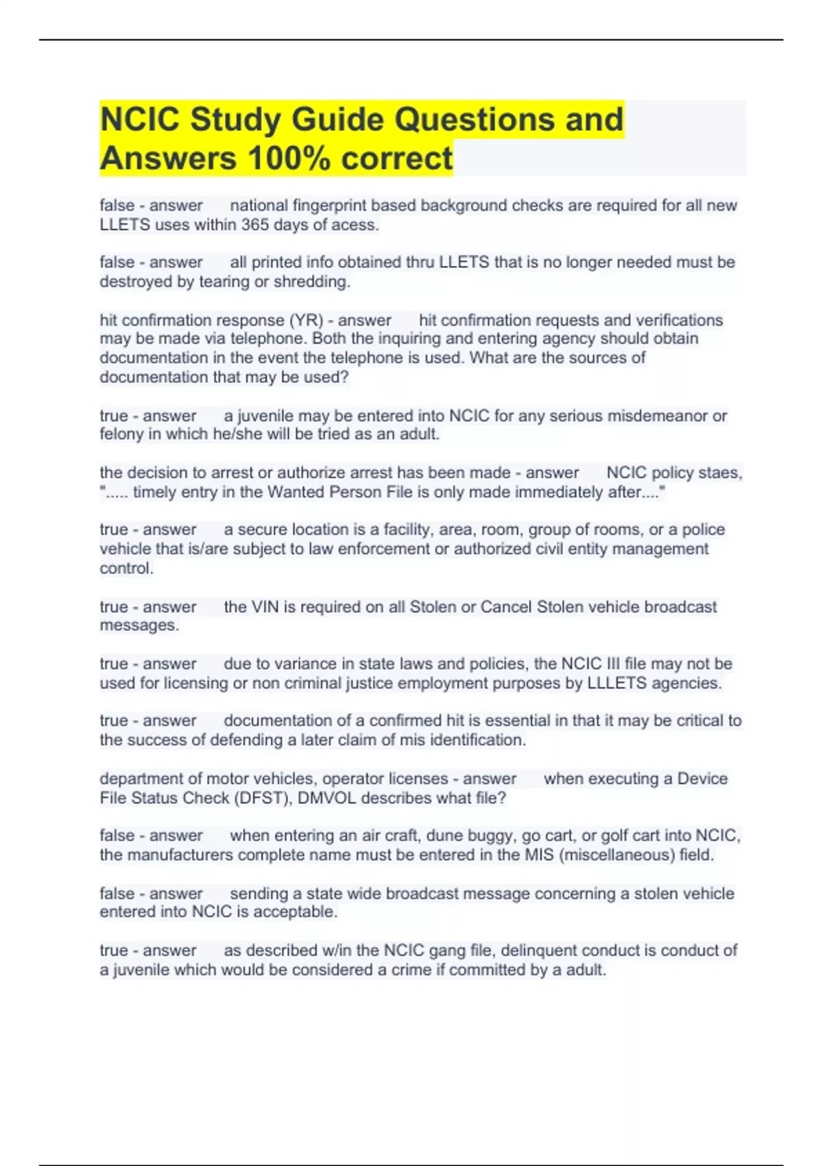 NCIC Study Guide Questions and Answers 100% correct false national fingerprint based background checks are required for all new LLETS uses within 365 days of acess. false all printed info obtained thru LLETS that is no longer needed must be destroyed by tearing or shredding. hit confirmation response (YR) hit confirmation requests and verifications may be made via telephone. Both the inquiring and entering agency should obtain documentation in the event the telephone is used. What are the sources of documentation that may be used? true a juvenile may be entered into NCIC for any serious misdemeanor or felony in which he/she will be tried as an adult. the decision to arrest or authorize arrest has been made NCIC policy staes, "..... timely entry in the Wanted Person File is only made immediately after...." true a secure location is a facility, area, room, group of rooms, or a police vehicle that is/are subject to law enforcement or authorized civil entity management control. true the VIN is required on all Stolen or Cancel Stolen vehicle broadcast messages. true due to variance in state laws and policies, the NCIC III file may not be used for licensing or non criminal justice employment purposes by LLLETS agencies. true documentation of a confirmed hit is essential in that it may be critical to the success of defending a later claim of mis identification. department of motor vehicles, operator licenses when executing a Device File Status Check (DFST), DMVOL describes what file? false when entering an air craft, dune buggy, go cart, or golf cart into NCIC, the manufacturers complete name must be entered in the MIS (miscellaneous) field. false sending a state wide broadcast message concerning a stolen vehicle entered into NCIC is acceptable. true as described w/in the NCIC gang file, delinquent conduct is conduct of a juvenile which would be considered a crime if committed by a adult. perform a DFST and check the NLETS file status in you inquire on a Texas OLN, and your response does not return w/in a reasonable amount of time, you should?? false regarding LLETS, the TAC is an agencys liaison or sold contact w/ state police. true a 3rd confirmation request will result in imposition or sanction approved by the NCIC advisory policy board. indicate the recovery by an agency other than the one which entered it to place a LOCATE on a stolen vehicle entry is to?? Louisiana law enforcement telecommunications system LLETS is an acronym for?? to indicate the location of the entry after it has been successfully recovered to CLEAR an NCIC entry is ??? true all NCIC entries should be checked by a 2nd party (other than the operator) brady indicator in regards to the NCIC Protection order file, BRD is an abbreviation for what?? true according to NCIC, agencies having terminals that access NCIC files should restrict access to the terminals area to the minimum number of authorized employees needed to complete the work. Louisiana state police HQ, NCIC/LLETS Access Integrity Unit in regards to LLETS difficulties, the 1st point of contact for an operator is?? criminal justice employment when inquiring on a NCIC iii records, purpose code J should be used for which of the following criteria?? false an agency may enter a vehicle into NCIC when the complainant is only interested in retrieving his/her property; such as an unauthorized use case. true all info obtained thru LLETS is regulated insert WWW in the name field and transmit to receive "MORE HITS" while inquiring on a louisiana vehicle registration by name, you should??? immediately confirm the hit and provide a specific amount of time in which the extradition info may be obtained the entering agency should be aware that the hit confirmation response is especially critical when dealing with the wanted person file. What should be done in instances where extradition authorization/info is not readily available??? false a user receiving a canadian record in response to a NCIC wanted person inquiry is advised in a caveat that the fugitive is wanted on a canadian warrat, No arrest can be executed in the US solely on this basis. true the state of mississippi is a participating NCIC iii state true all agencies are responsible for the removal of their NCIC records as soon as it is aware that the record is no longer valid. false from the date a report is filed, agencies have a maximum of 3 days to enter a non emancipated missing person (child). criminal justice or authorized civil purposes only access to and use of the FBI CJI is only for??? none of the above all NCIC gun inquiry responses (aka:HITS) must be compared to the weapon for a valid match because?? false FBI CJI date may be shared with close friends true a stolen vehicle record that does not contain a VIN or OAN will remain in NCIC for a period of 90 days, at which time the report will be purged. true the NLETS o line ORI(aka ORION) file was implemented on June 30th 1985. This file gives all users the ability to inquire upon any originating agency identifier (ORI) and receive the agency name, address, and telephone number in response. to delete the entry after it has been deemed invalid to CANCEL an NCIC entry is ??? the agency/section name all LLETS inquire must include a completed ATTN field which must include ?? false when a non terminal agency requests a CRIMINAL HISTORY inquiry thru their assigned terminal agency, the non terminal agencys ORI must be used true any color tv, regardless of value, may be entered into the NCIC article file. all of the above a missing person may be entered into NCIC using the category ENDANGERED if the person true upon receiving a US secret service file response, or hit, an arrest should be made immediately. true a log shall be maintained for a period of 2 months for all NCIC and iii transcations true certain offenses against system security and the info contained therein are considered criminal offenses and can result in prosecution. false all agencies that enter NCIC reco