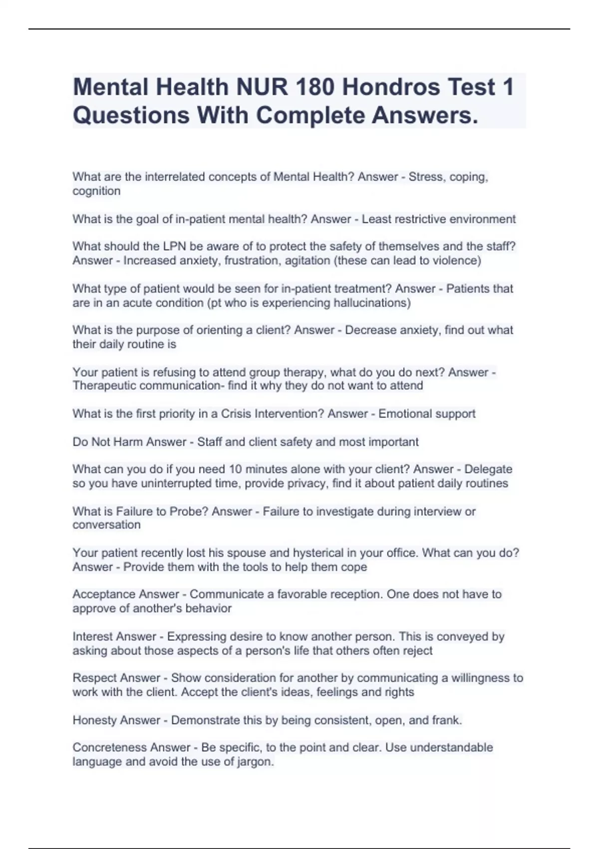 Mental Health NUR 180 Hondros Test 1 Questions With Complete Answers.