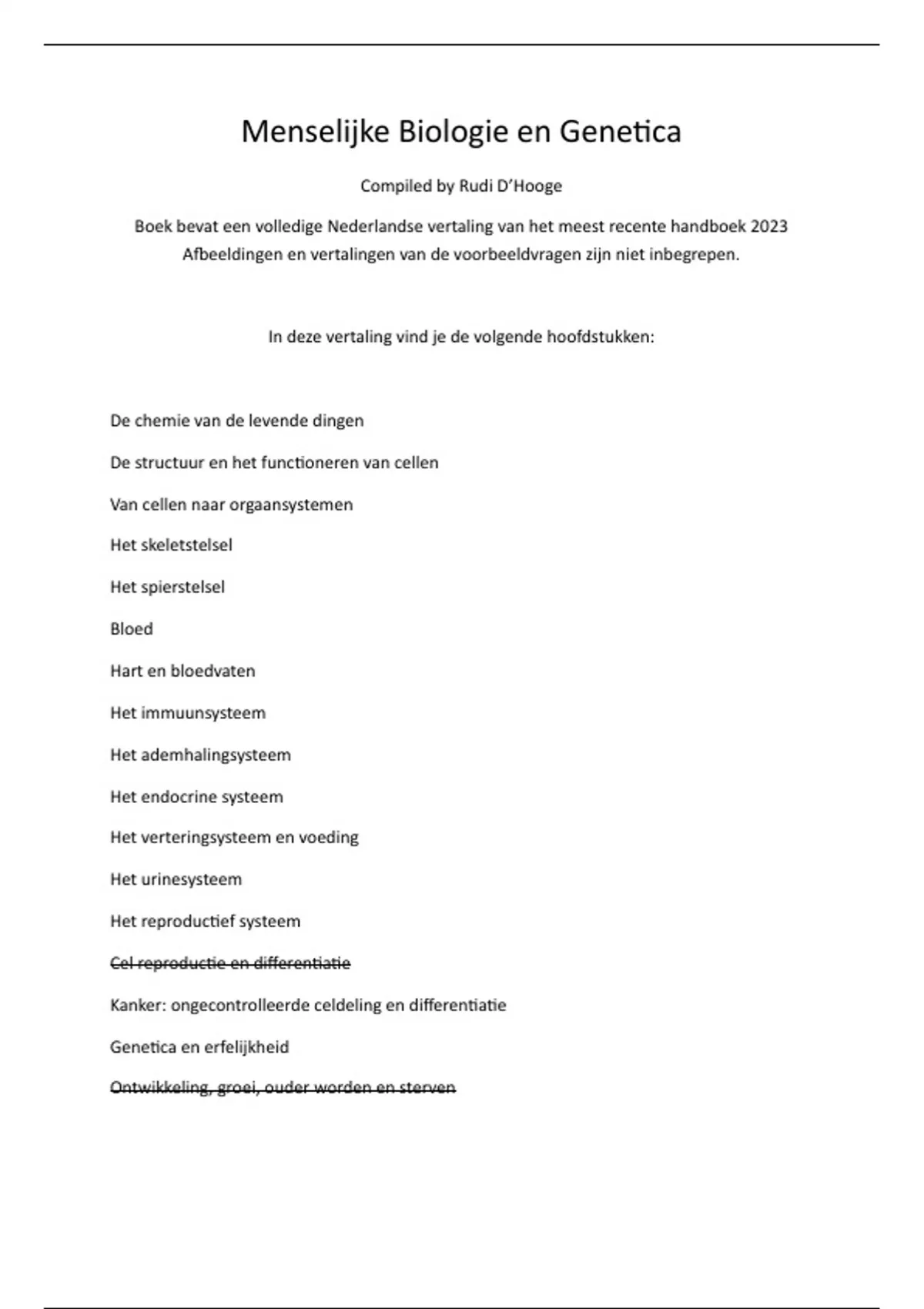 Boek bevat een volledige Nederlandse vertaling van het meest recente handboek 2023: Human Biology (Rudi D'hooge) voor het vak Menselijke Biologie en Genetica Afbeeldingen en vertalingen van de voorbeeldvragen zijn niet inbegrepen. In deze vertaling vind je de volgende hoofdstukken: De chemie van de levende dingen De structuur en het funcHoneren van cellen Van cellen naar orgaansystemen Het skeletstelsel Het spierstelsel Bloed Hart en bloedvaten Het immuunsysteem Het ademhalingsysteem Het endocrine systeem Het verteringsysteem en voeding Het urinesysteem Het reproductief systeem Cel reproductie en differentiatie (niet inbegrepen!) Kanker: ongecontrolleerde celdeling en differentiatie Genetica en erfelijkheid Ontwikkeling, groei, ouder worden en sterven (niet inbegrepen!)