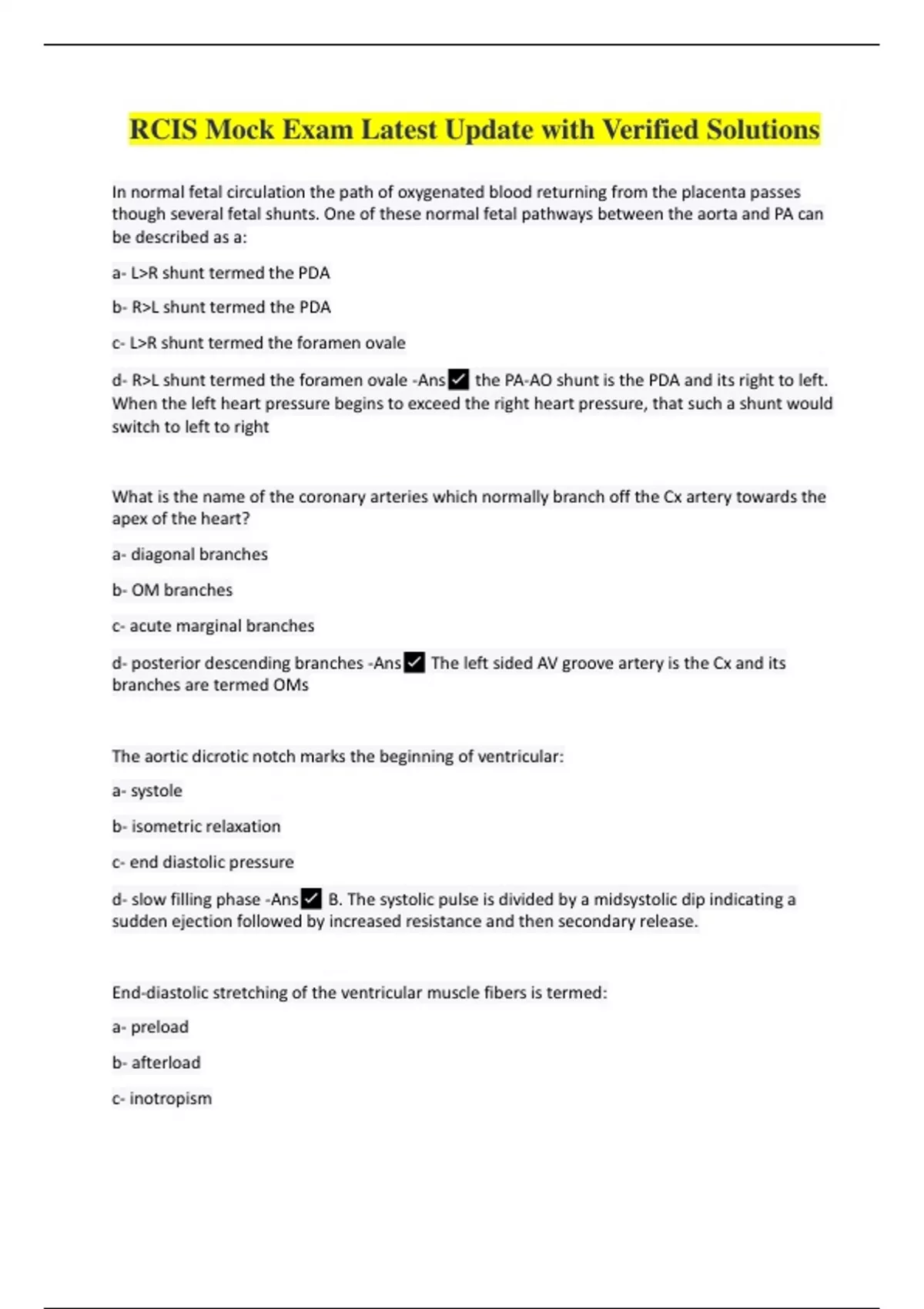 RCIS Mock Exam Latest Update with Verified Solutions In normal fetal circulation the path of oxygenated blood returning from the placenta passes though several fetal shunts. One of these normal fetal pathways between the aorta and PA can be described as a: a- L>R shunt termed the PDA b- R>L shunt termed the PDA c- L>R shunt termed the foramen ovale d- R>L shunt termed the foramen ovale -Ans the PA-AO shunt is the PDA and its right to left. When the left heart pressure begins to exceed the right heart pressure, that such a shunt would switch to left to right What is the name of the coronary arteries which normally branch off the Cx artery towards the apex of the heart? a- diagonal branches b- OM branches c- acute marginal branches d- posterior descending branches -Ans The left sided AV groove artery is the Cx and its branches are termed OMs The aortic dicrotic notch marks the beginning of ventricular: a- systole b- isometric relaxation c- end diastolic pressure d- slow filling phase -Ans B. The systolic pulse is divided by a midsystolic dip indicating a sudden ejection followed by increased resistance and then secondary release. End-diastolic stretching of the ventricular muscle fibers is termed: a- preload b- afterload c- inotropism d- chronotropism -Ans Preload refers to the filling of the ventricular chambers in diastole The greatest expenditure of O2 during the cardiac cycle is used to: a- open the aortic valve (isometric contraction) b- open the mitral valve (diastolic filling) c- eject blood out of the LV and into the AO (SEP) d- overcome friction of blood viscosity and muscle compliance -Ans A. One of the chief benefits of IABP is to lower the pressure at which the aortic valve opens, which decreases pressure work. This pressure work account for 90% of the work done by the LV Which of the following is a common result of right sided heart failure? a- dyspnea b- pulmonary congestion c- pulmonary hypertension d- neck vein distension -Ans When the right side of the heart fails the RA and systemic veins become engorged with blood. Pulmonary hypertension is only a compensation to left sided failure Which of the following is NOT a clinical manifestation of shock? a- pallor b- metabolic acidosis c- slow bounding pulse d- falling blood pressure -Ans Slow bounding pulse. Tachycardia usually results to compensate for decreased tissue perfusion If an embolus were to lodge in the distal RCA at the crux, which segment of the heart would suffer damage? a- RV b- inferior LV wall c- anterior LV wall d- posterior lateral LV wall -Ans Inferior infarctions usually result from RCA infarction. The distal RCA feeds the lower 1/3 of the IV septum and the inferior aspect of the LV depending on the extent of posterior lateral RV branches Aortic stenosis is classified as what type of disease? a- restrictive b- hypertrophic c- inflow obstructive d- outflow obstructive -Ans Obstructive refers to stenosis or inability to EXIT a chamber An OLD myocardial infarct is seen on the ECG as a significant: a- Q wave b- inverted T wave c- elevated ST segment d- depressed ST segment -Ans Q waves never go away after myocardial tissue dies