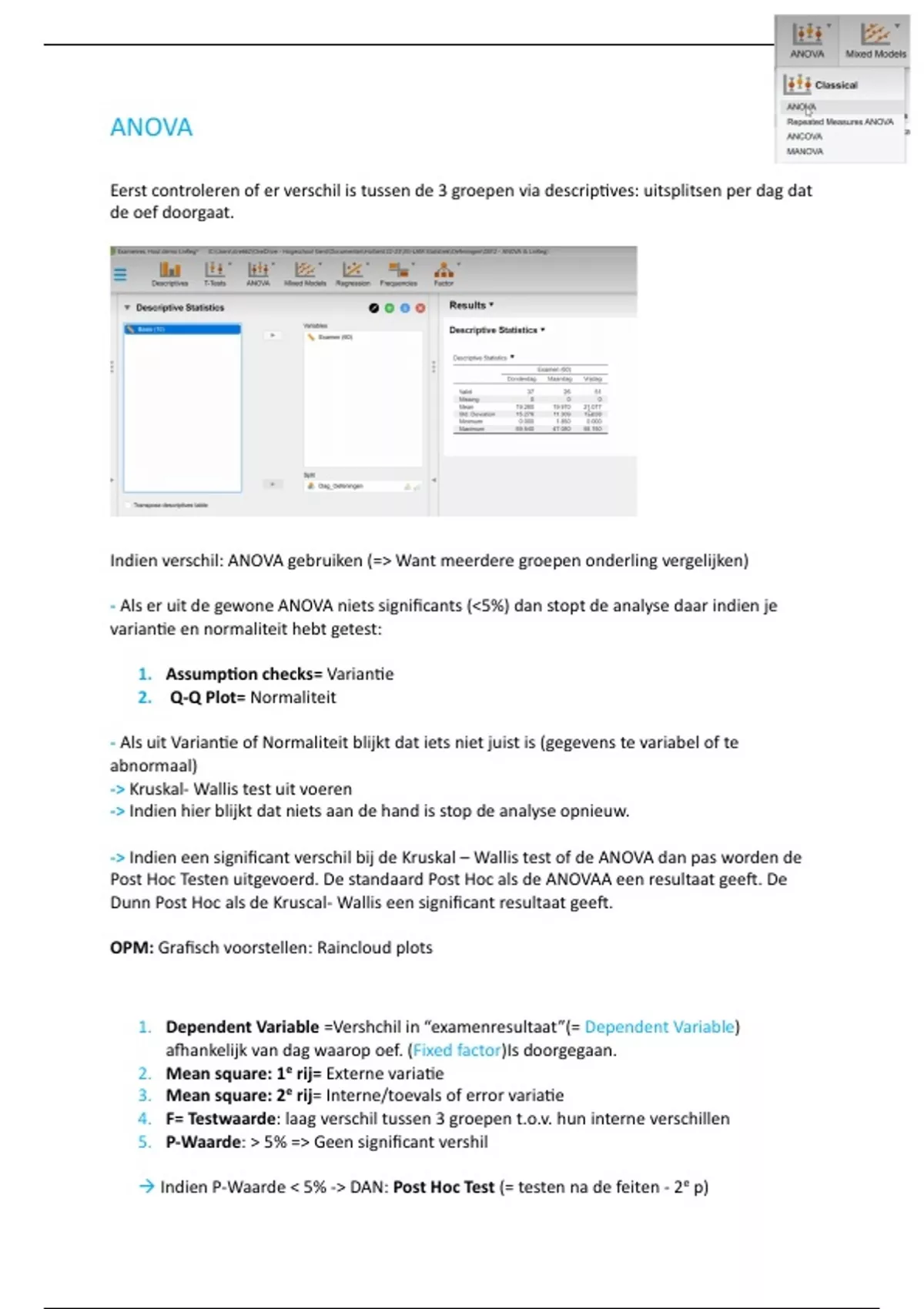 → Assumption checks (bij ANOVA Levene’s)-> Altijd! → Kijken naar P-waarde